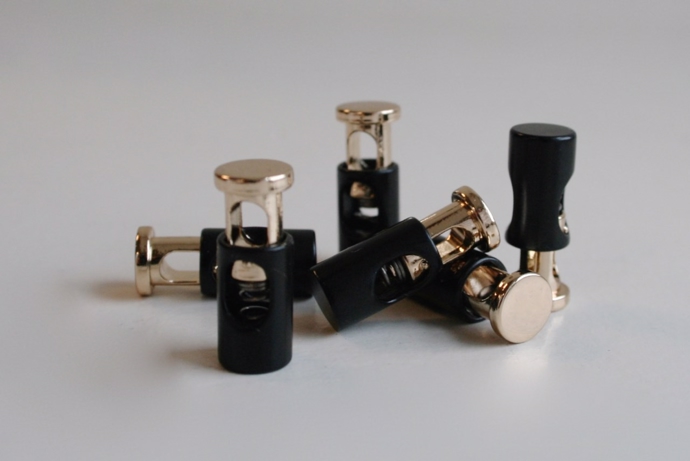 Sølv/sort cylinderformet snorestopper i metal.