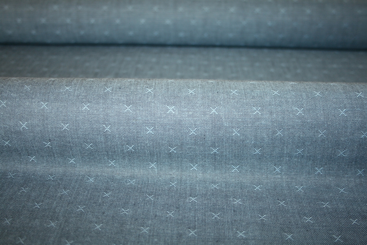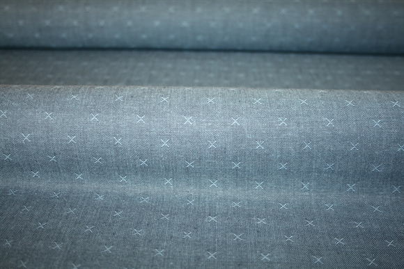 100% bomuld fra Fableism Supply Co. Stoffet er ivævet små krydser, som giver en diskret effekt. Kvaliteten er fastvævet og let-medium kraftig.