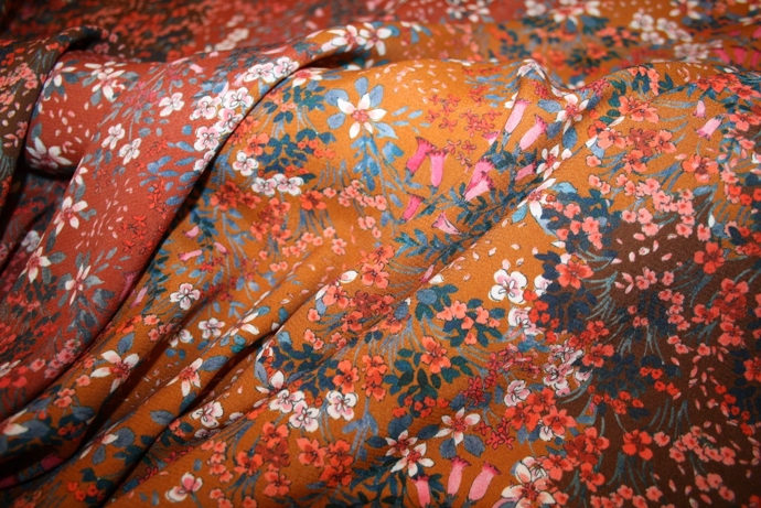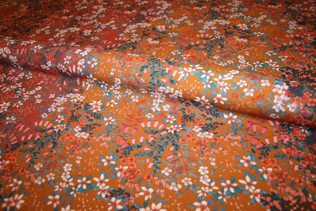 Fastvævet (EcoVero) viscose crepe med små blomster på en skiftende bundfarve i brændte farver. Kvaliteten er let og lækker og fremstillet på en mere skånsom måde end traditionel viscose.