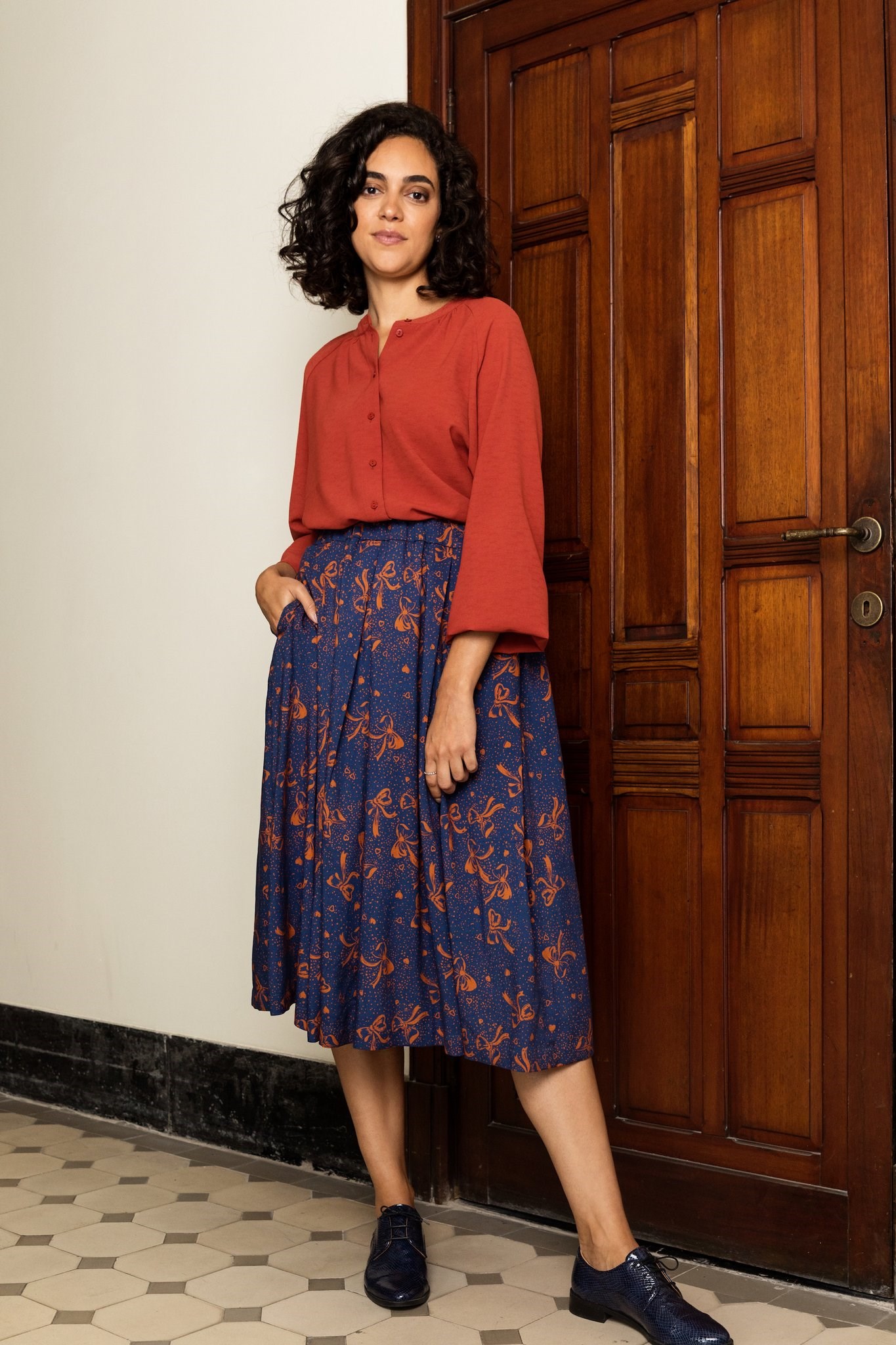 Stina er en rynket nederdel med omvendte læg. For- og bagside har hver tre læg, og lommerne er skjult i et læg i sidesømmen. Nederdelen er mellemlang. En elastik i linningen gør mønsteret velegnet til begyndere inden for syning.