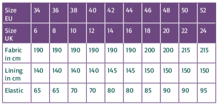 Materialeforbrug (v. stofbredde 140 cm.):