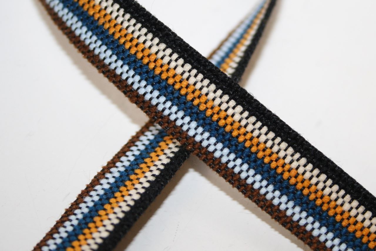 Vævet bånd med flerfarvede striber. Lidt kraftigere kvalitet.