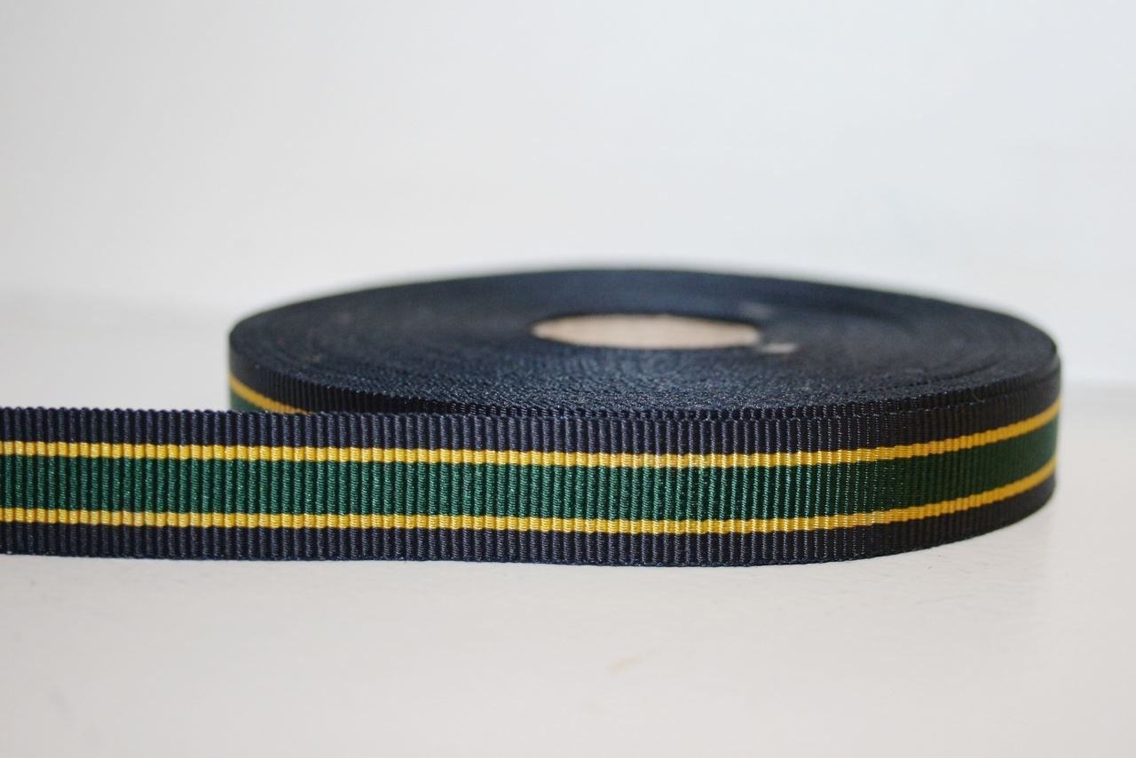 Vævet grosgrainbånd med striber i navy, mørkegrøn og gul. Båndet er 1,5 cm. bredt.