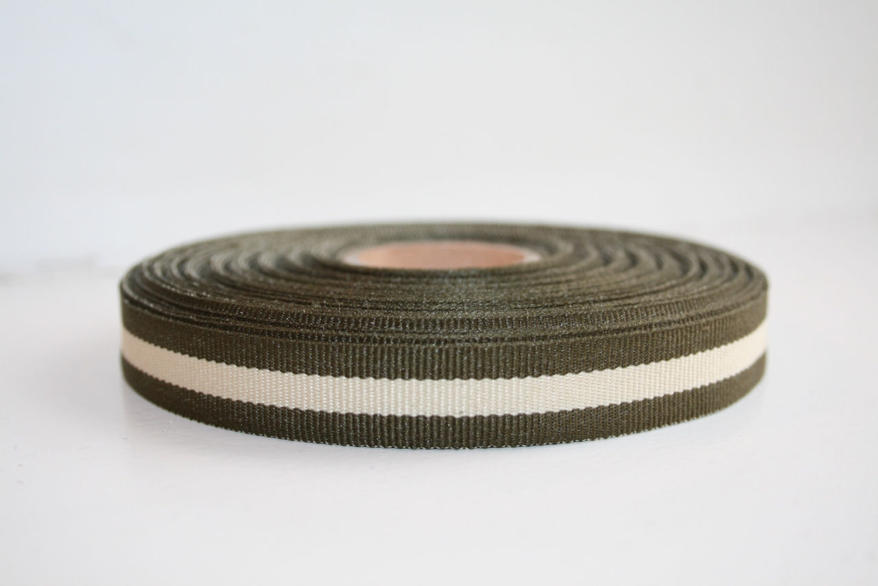 Stribet grosgrainbånd i mosgrøn og offwhite. Båndet er 1,5 cm. bredt.