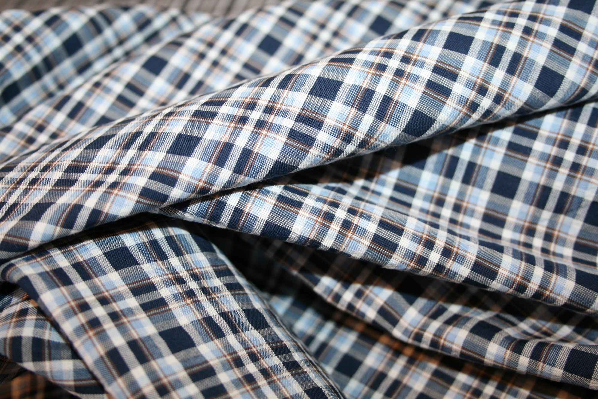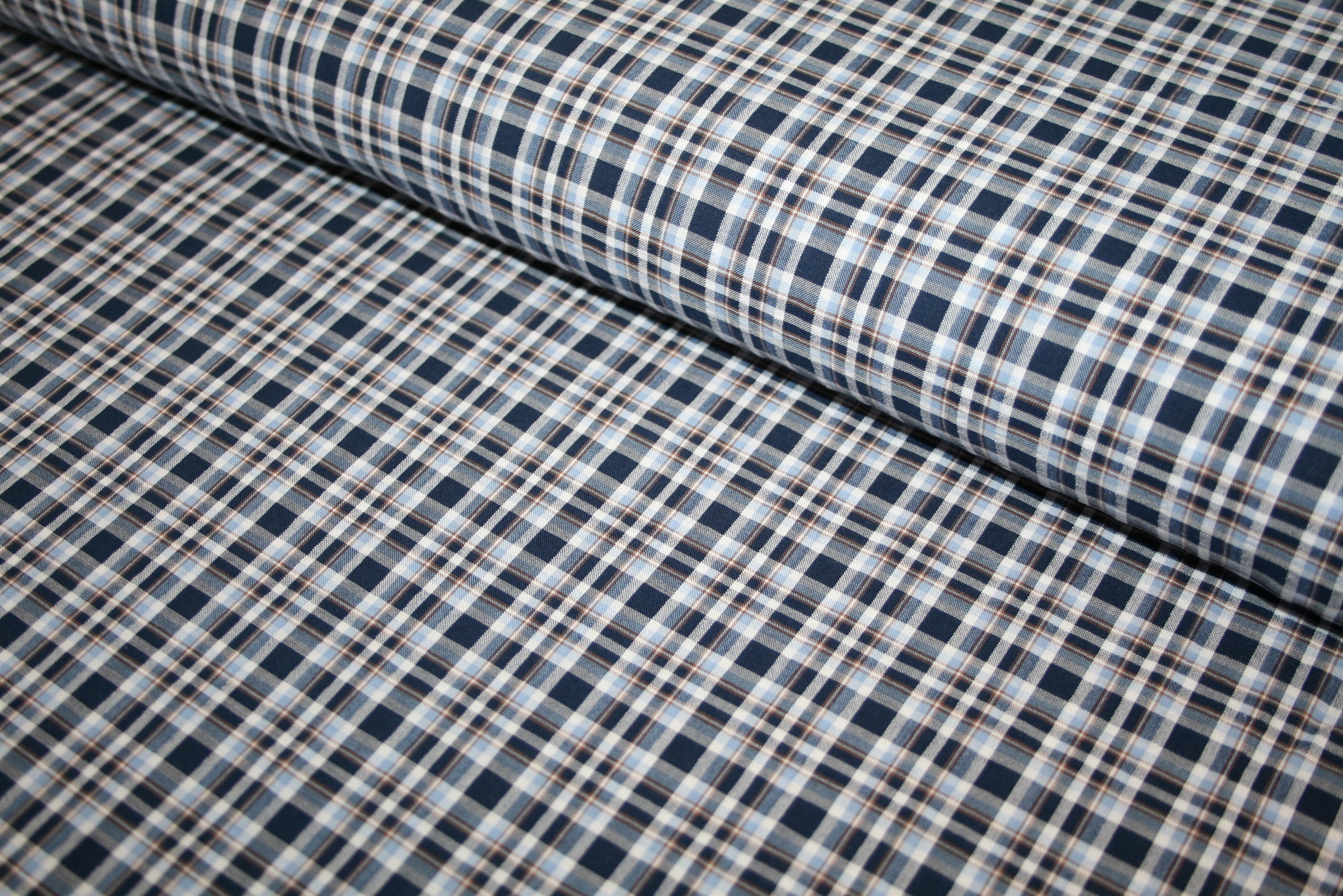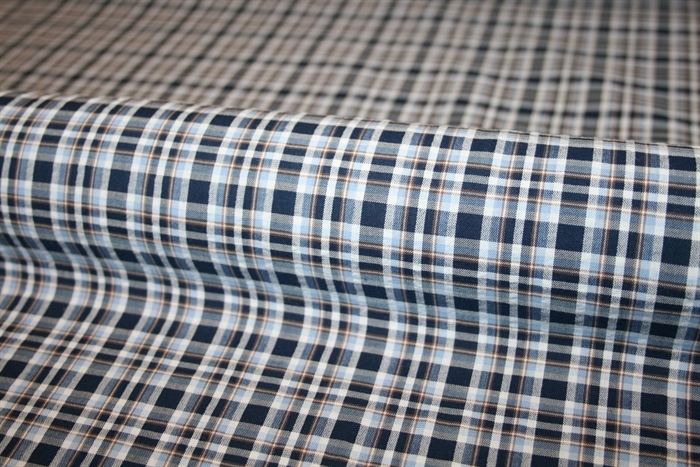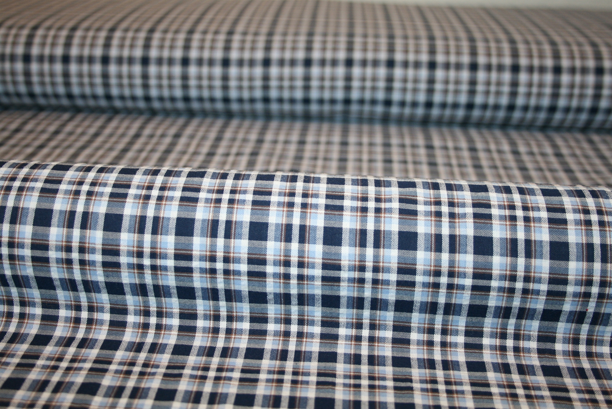 100% bomuld med mindre tern. Kvaliteten er let og har en smule seersucker struktur i vævningen.