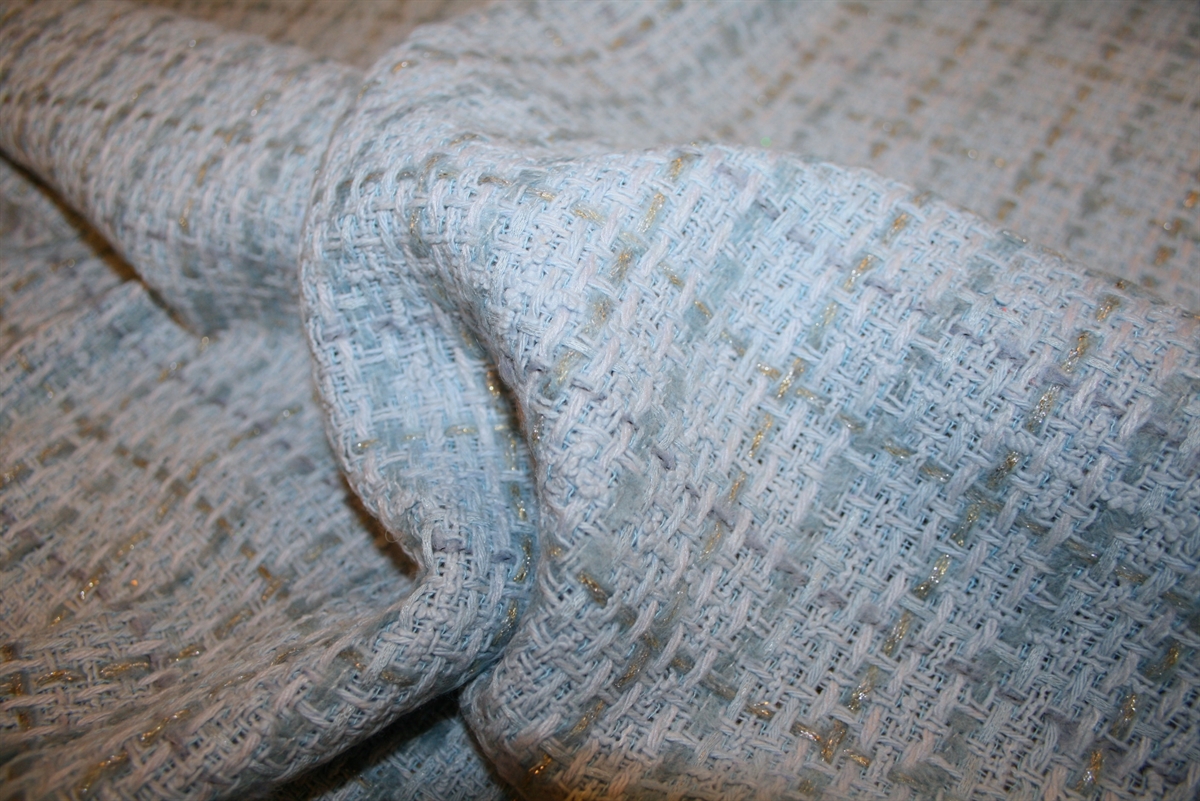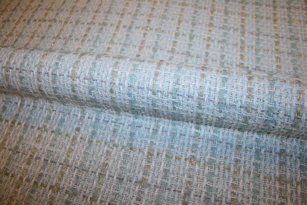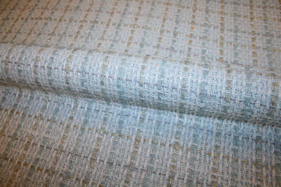Lyseblå uld bouclé med subtilt skinnende guld-lurex tern. Kvaliteten er blød og medium kraftig. Stoffet er produceret for internationalt modehus.