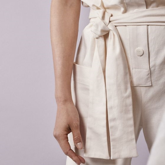 "A jumpsuit with a straight cut and feminine accents.