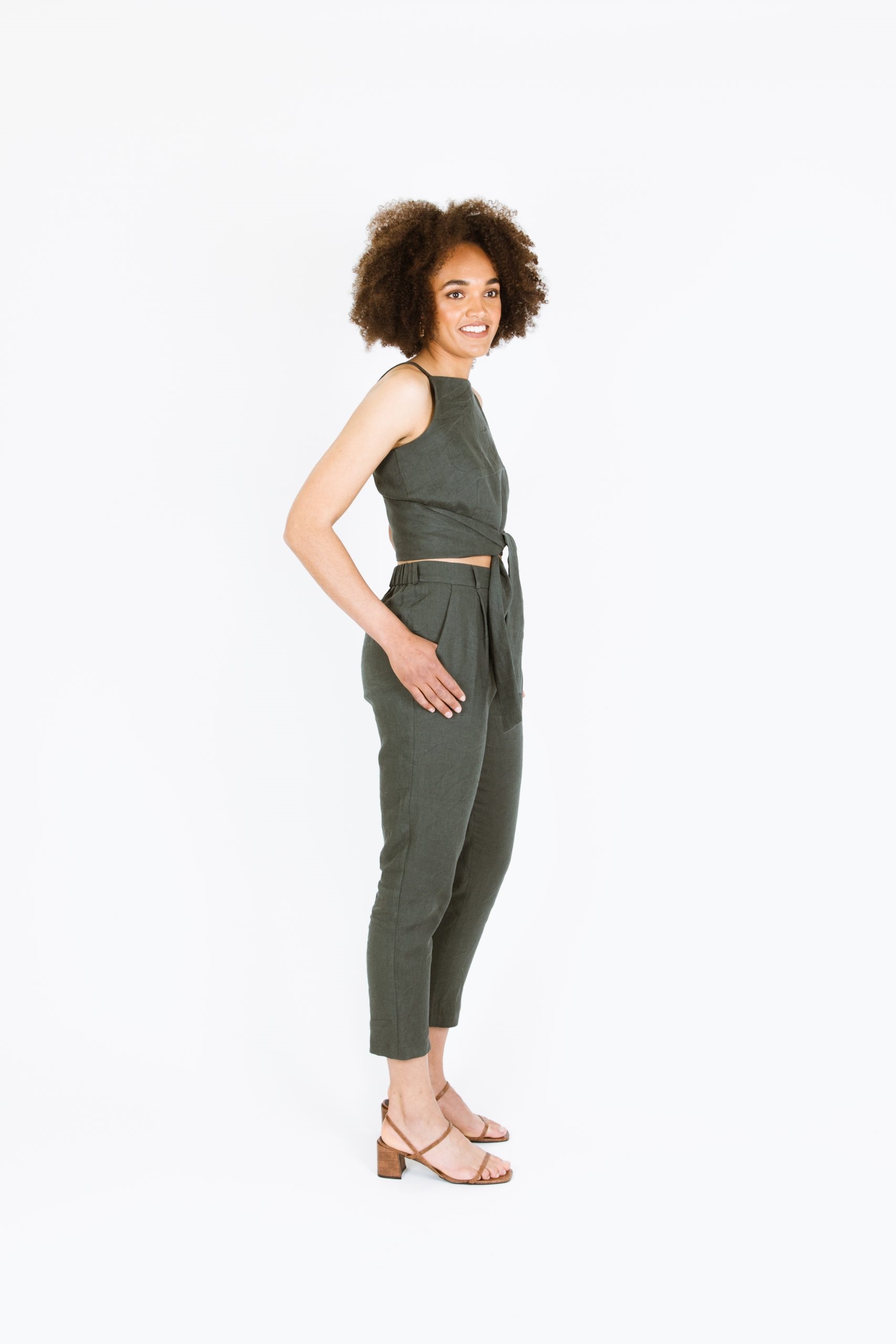 Papercut Patterns snitmønster til cool og samtidig komfortable bukser med læg, lommer og elastisk bærestykke bagpå.