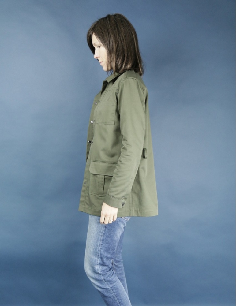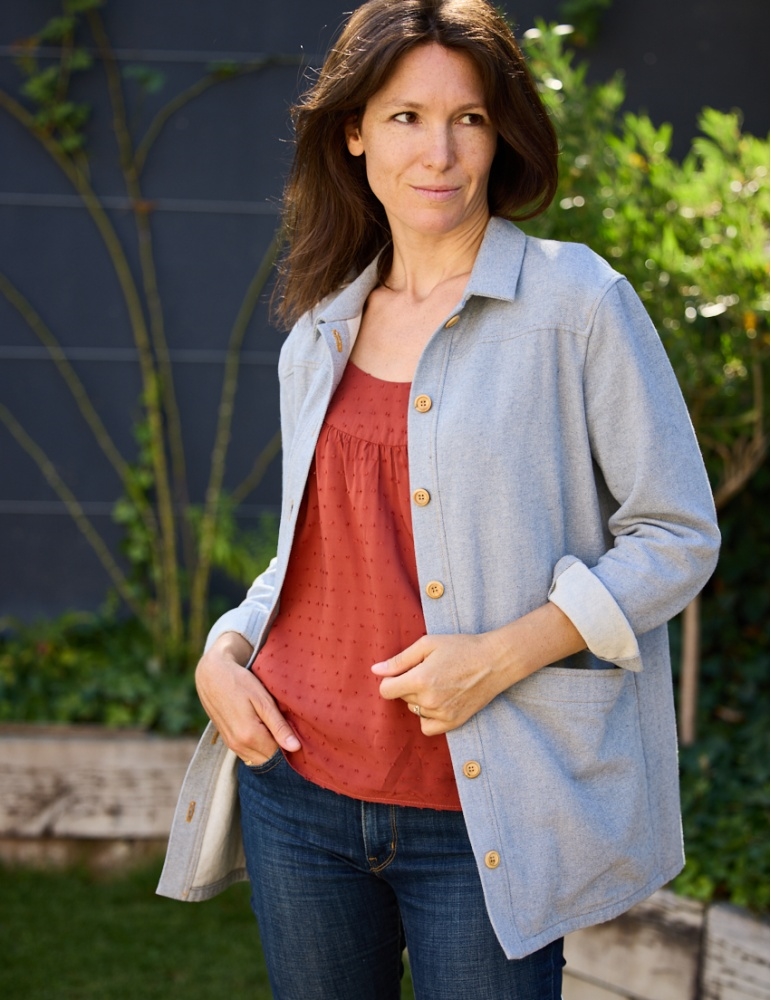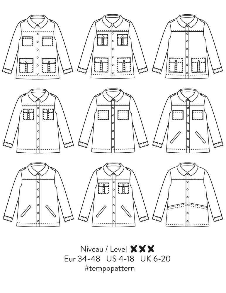 Snitmønster til stilfuld overgangsjakke med masser af gennemtænkte detaljer og variationsmuligheder (lommer og bælte). Jakken er ikke foeret.