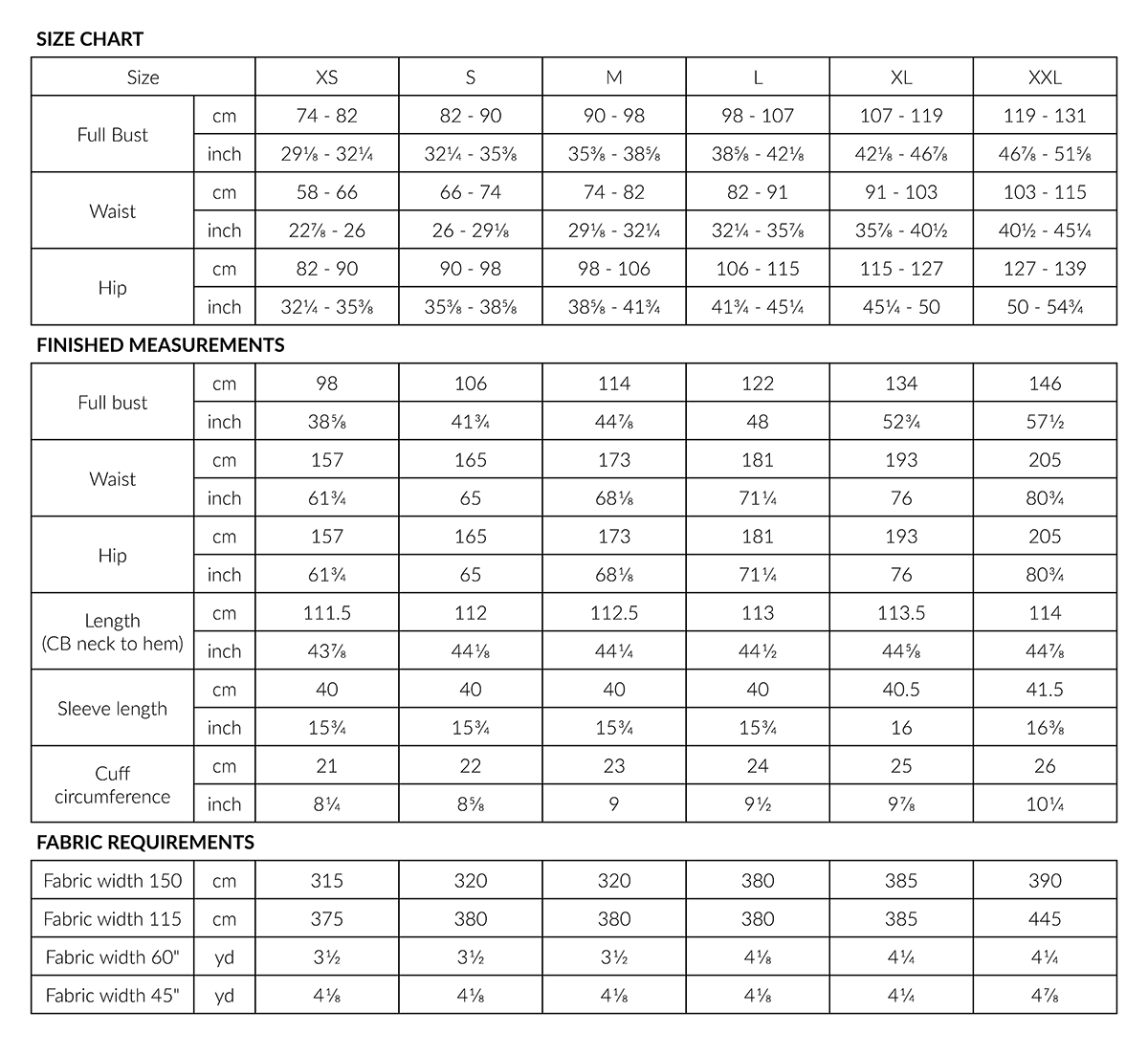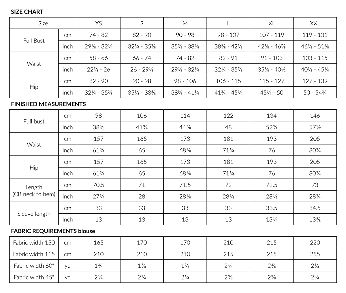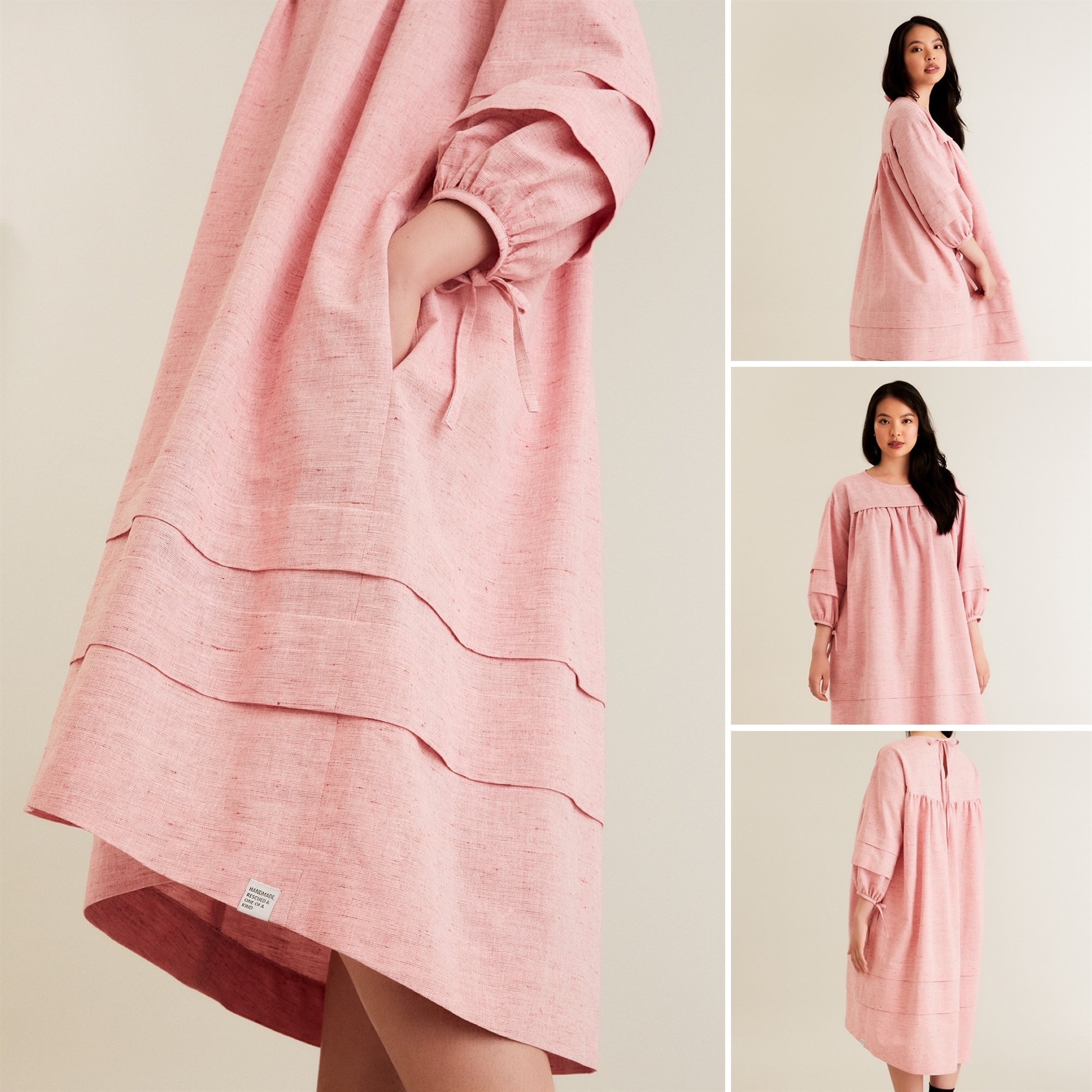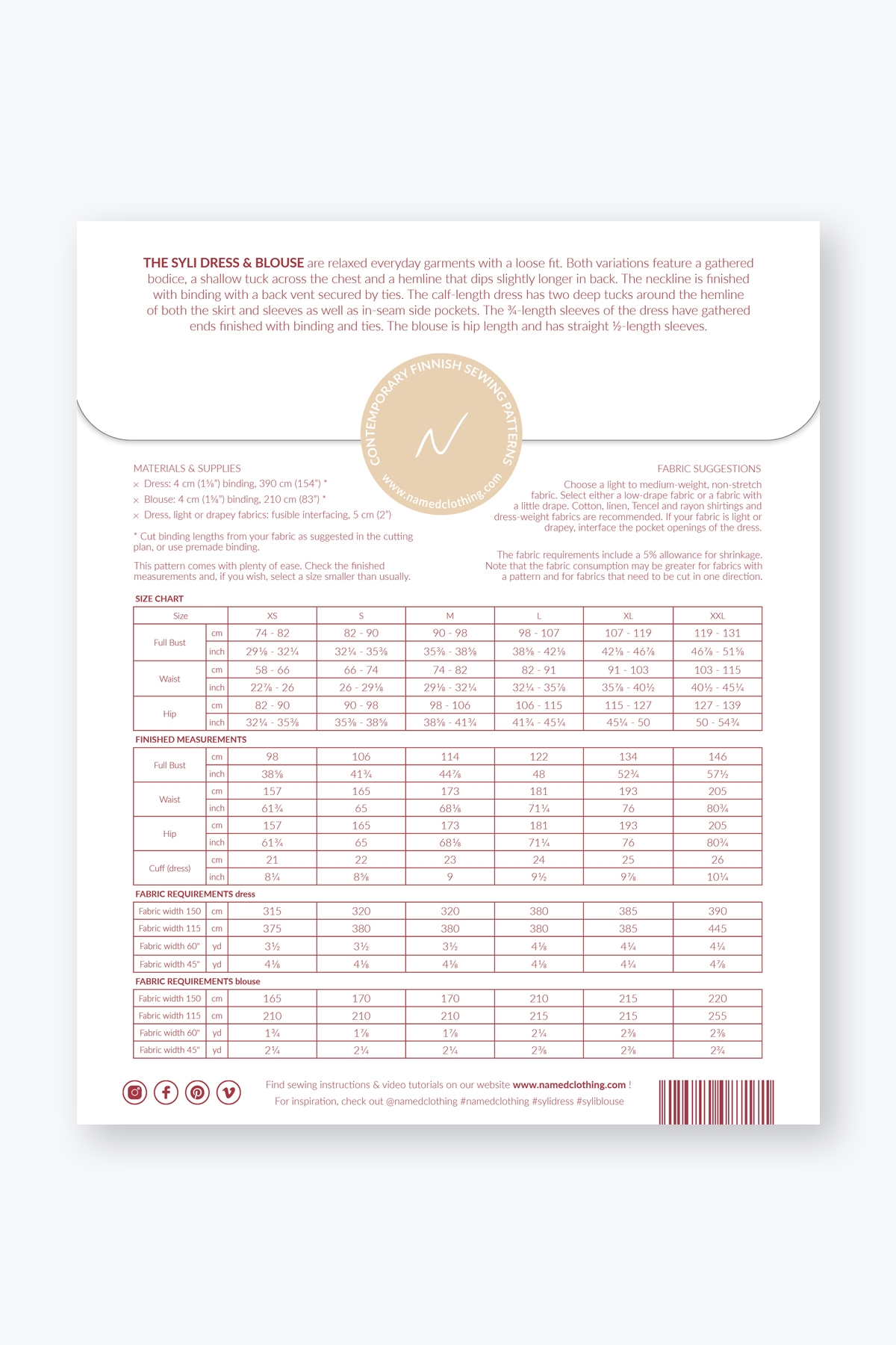 "The Syli dress and blouse are relaxed everyday garments with a loose fit. Both variations feature a gathered bodice, a shallow tuck across the chest and a hemline that dips slightly longer in back. The neckline is finished with binding with a back vent secured by ties. The calf-length dress has two deep tucks around the hemline of both the skirt and sleeves as well as in-seam side pockets. The ¾-length sleeves of the dress have gathered ends finished with binding and ties. The blouse is hip length and has straight ½-length sleeves with turned hems."