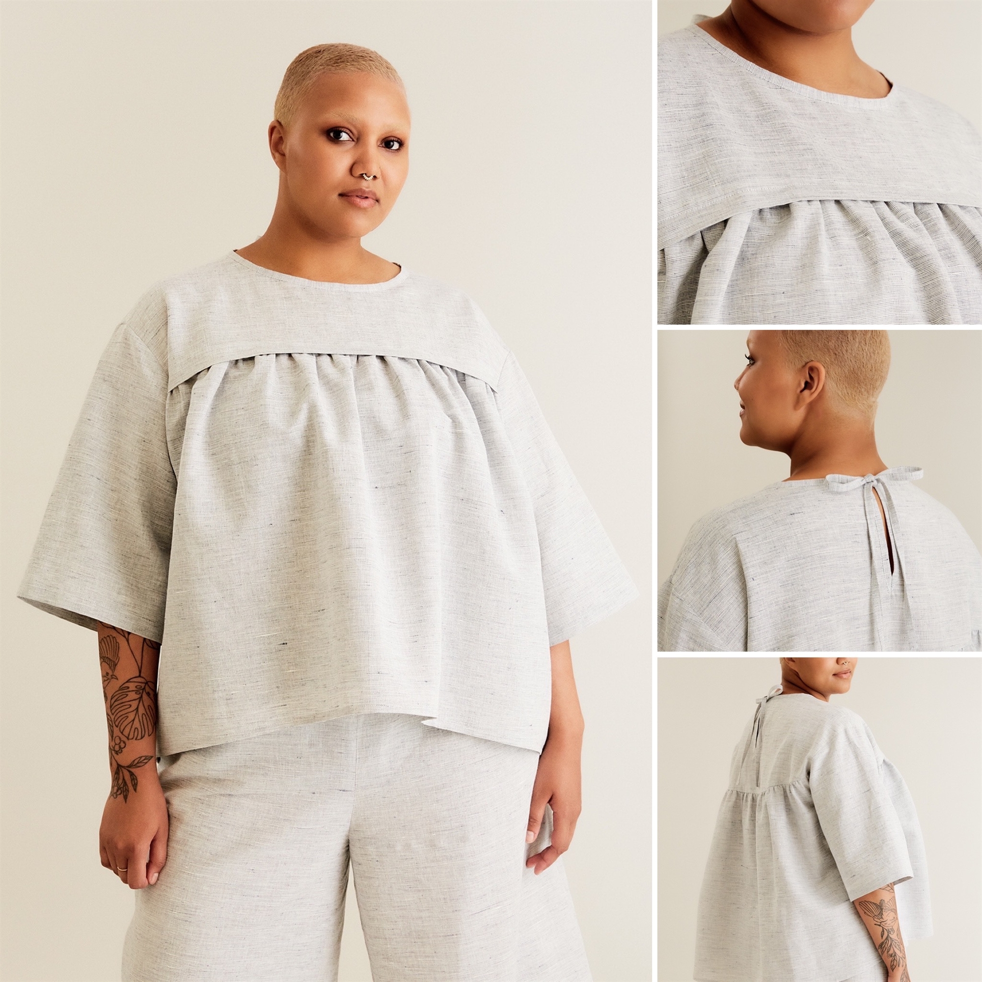 Snitmønster til loose-fit bluse og kjole med flæser (Papercut Patterns). Snitmønsteret indeholder flere variationsmuligheder.