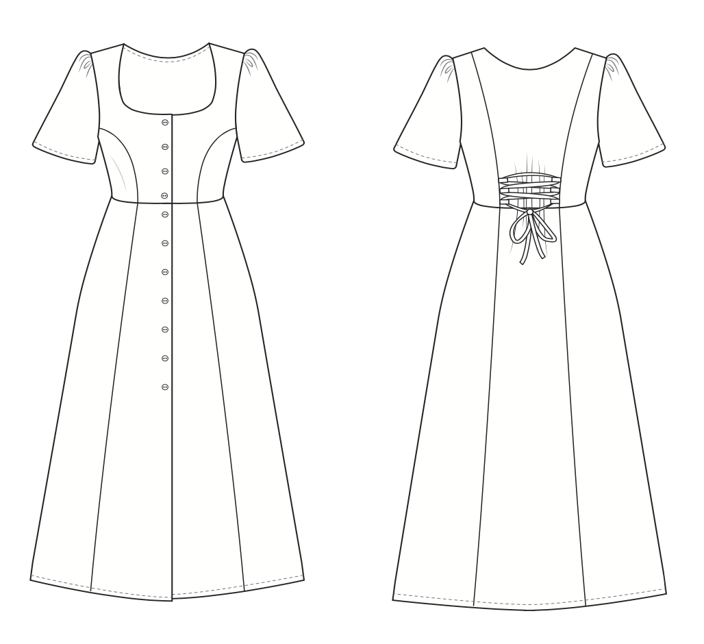 "The Hughes is the perfect everyday dress. It features Viennese seams, gathered sleeves, and a gorgeous scoop neckline. The bodice is lined and the skirt has an a-line sweep. It buttons up the front and has an adjustable lace-up tie in the back. The tie can be cinched in or loosened depending on desired fit. The Hughes Dress is designed to be a timeless style with beautiful construction details that can be treasured for generations."