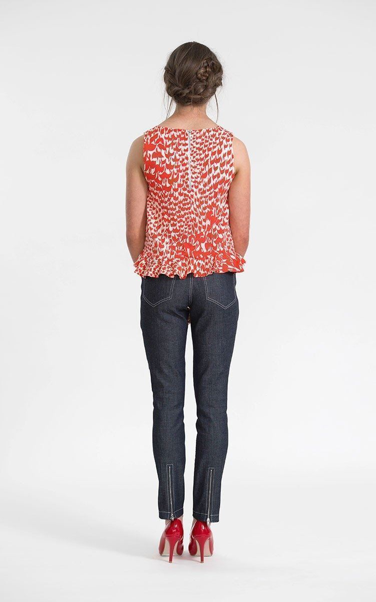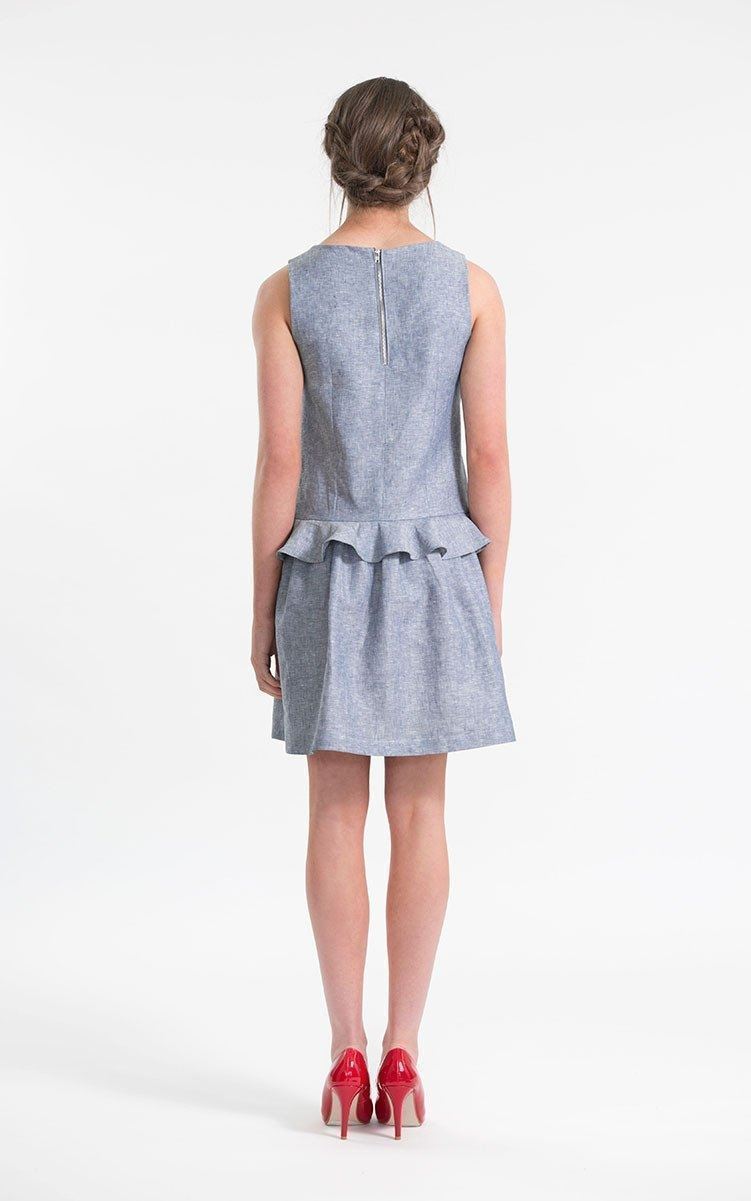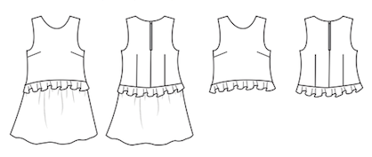 Snitmønster til ærmeløs kjole og top med bølgende volant.
