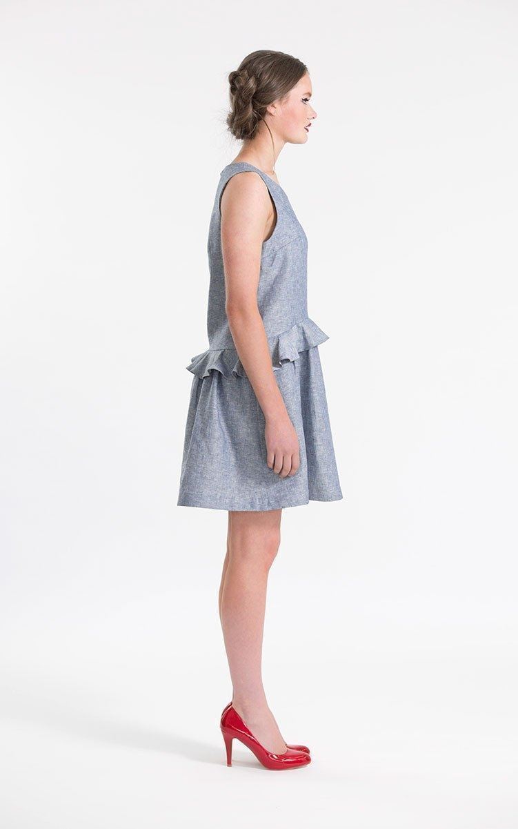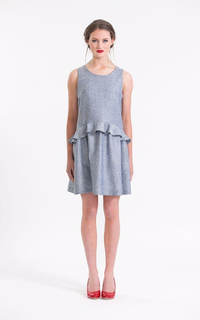Snitmønster til 'relax-fit' sommerkjole og top med bølgende volant, bryst -og rygindsnit og synlig lynlås i nakken.