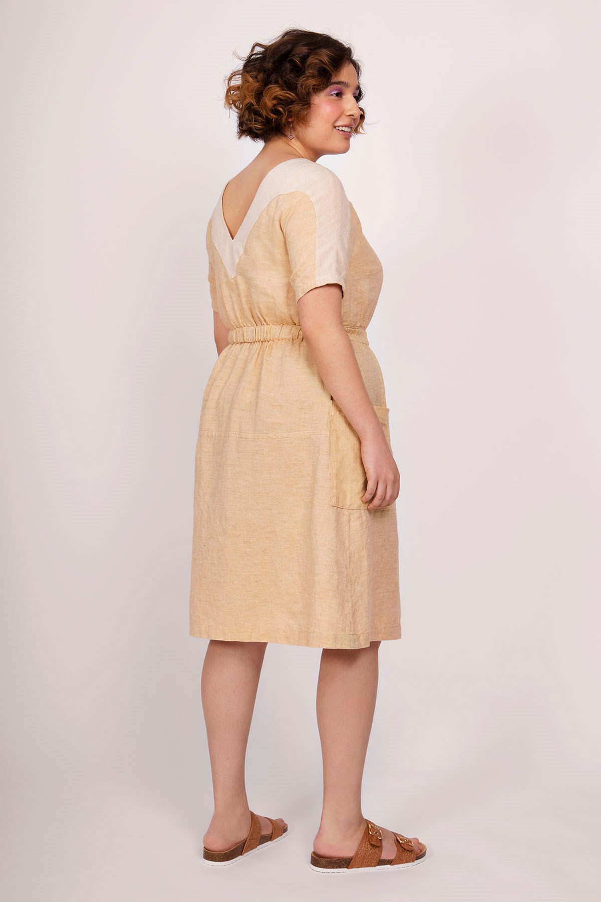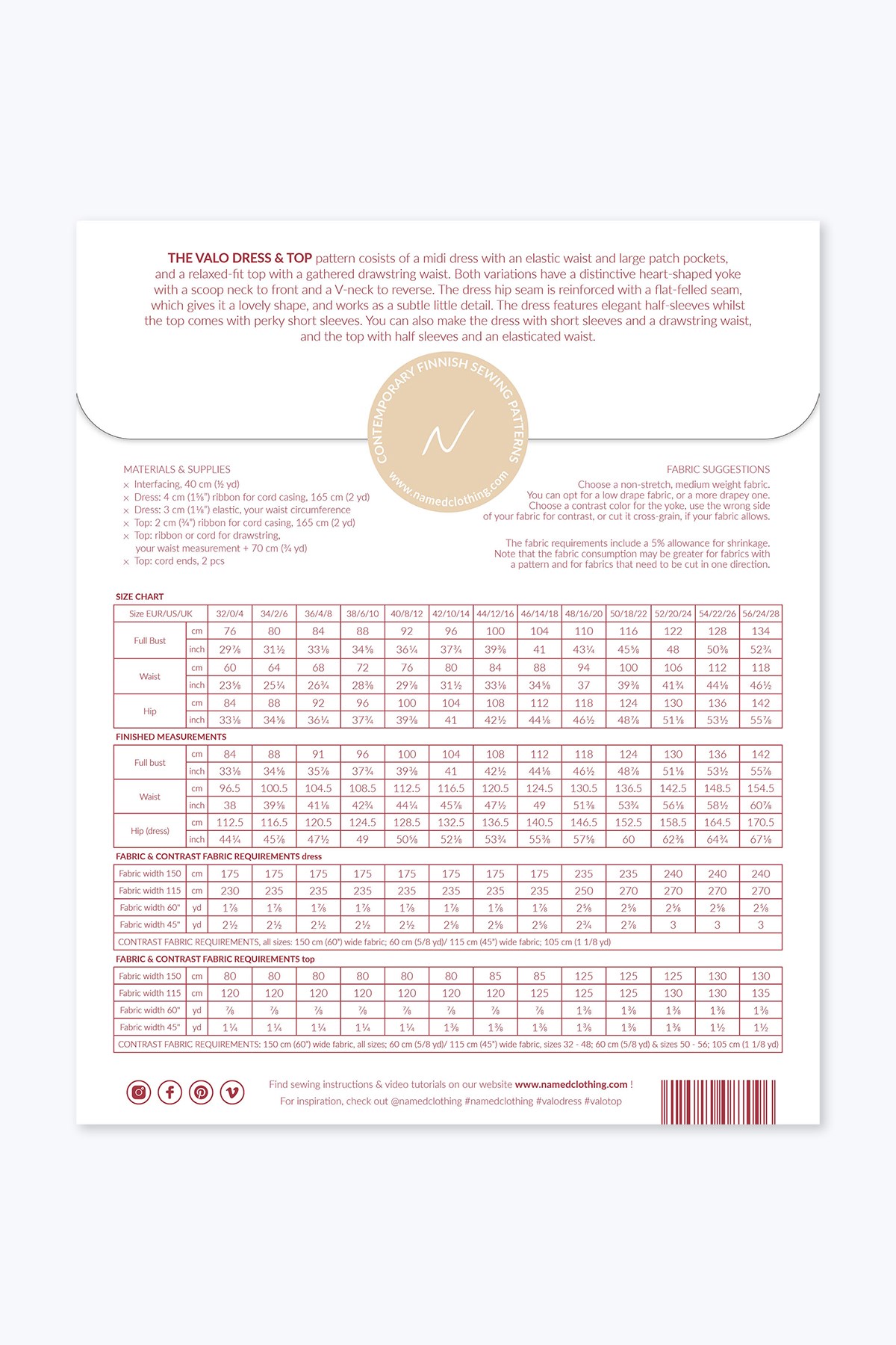 "The Valo pattern includes two variations: a midi dress with an elastic waist and large patch pockets, and a relaxed-fit top with a gathered drawstring waist. Both variations have a distinctive heart-shaped yoke with a scoop neck to front and a V-neck to reverse. The dress hip seam is reinforced with a flat-felled seam, which gives it a lovely shape, and works as a subtle little detail. The dress features elegant half-sleeves whilst the top comes with perky short sleeves. You can also make the dress with short sleeves and a drawstring waist, and the top with half sleeves and an elasticated waist."