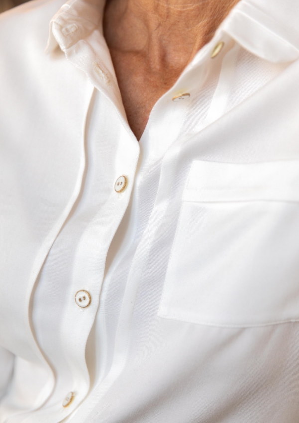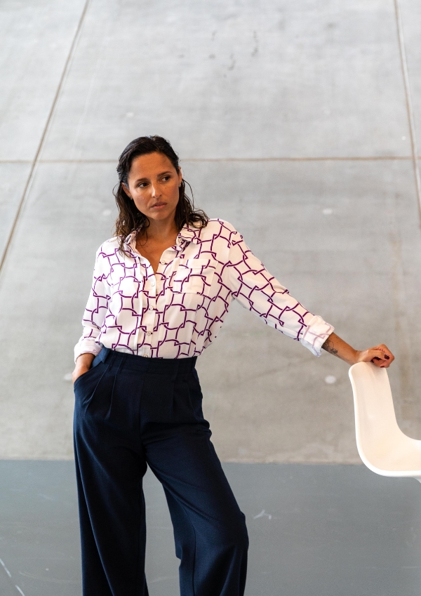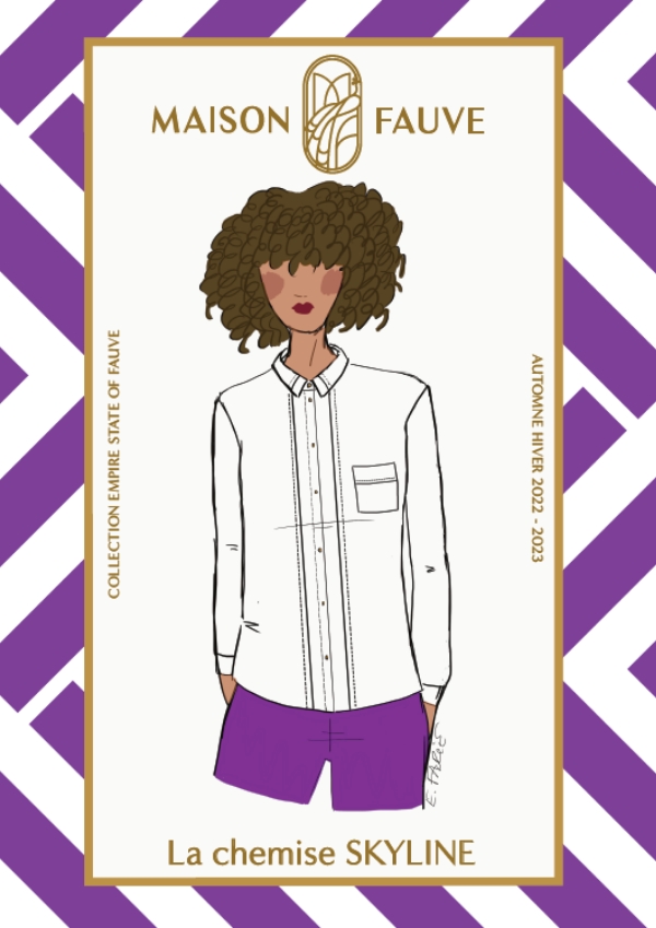 "If there is only one shirt in your wardrobe, it will be Skyline! Its cut is timeless, straight but not loose, the length is perfect to be worn outside as well as slipped into pants. The Skyline shirt is distinguished by its very Fauve details, stitched pleats on the front, collar, back and cuffs but also by its duo of classic collar and Claudine collar and a possibility to sew an opening in the back, a small triangle of skin that reveals itself without showing too much. With this nice pattern, you can decline the "essential white shirt" but the colors and prints are also very good for the complexion ;)