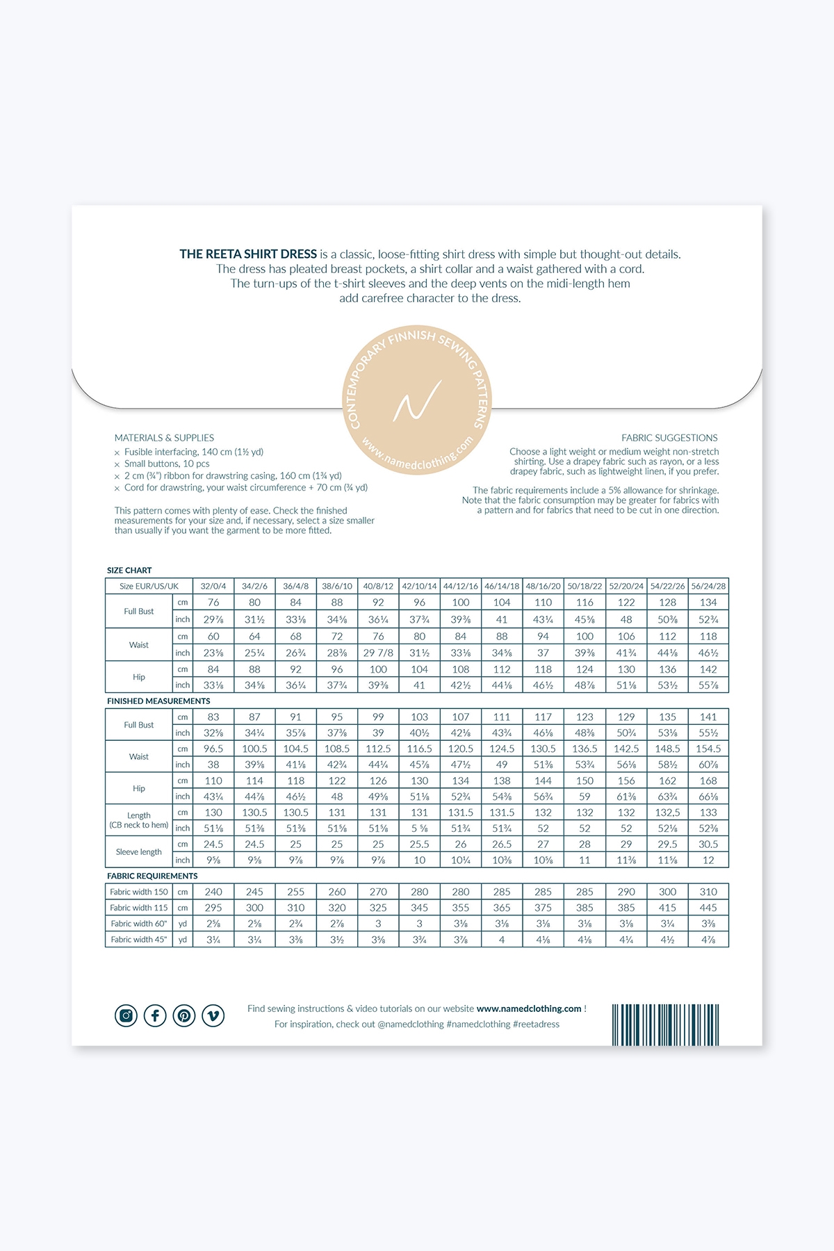 Dette snitmønster fra finske Named Clothing kommer i størrelserne 32-56, og der medfølger udførlig engelsk syvejledning med illustrationer. Mønsteret er inkl. sømrum.