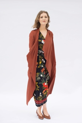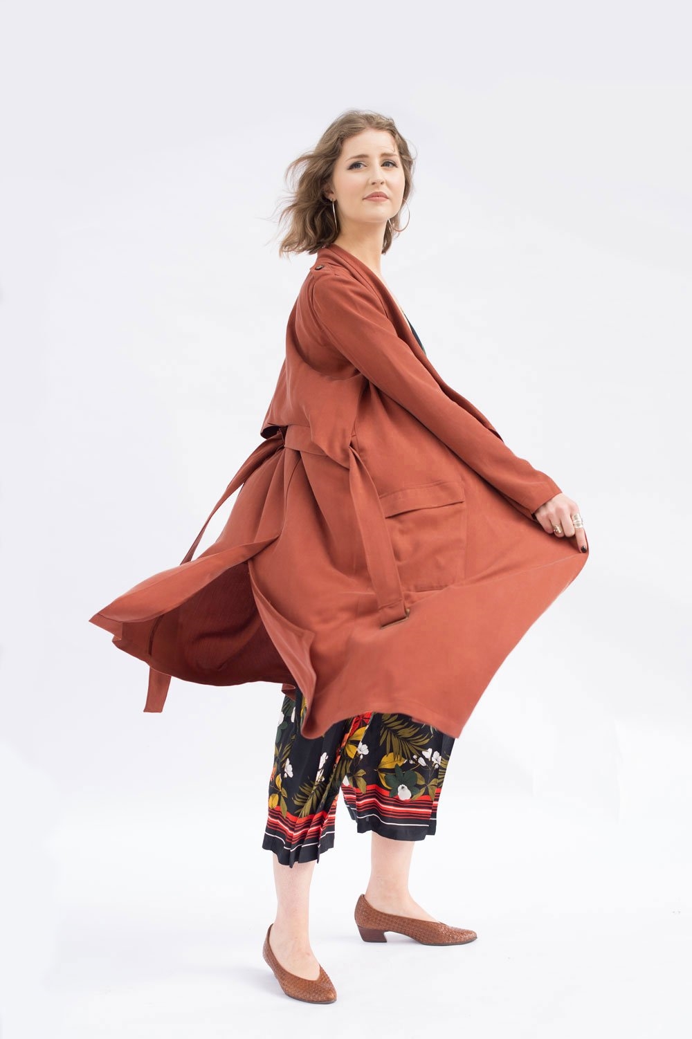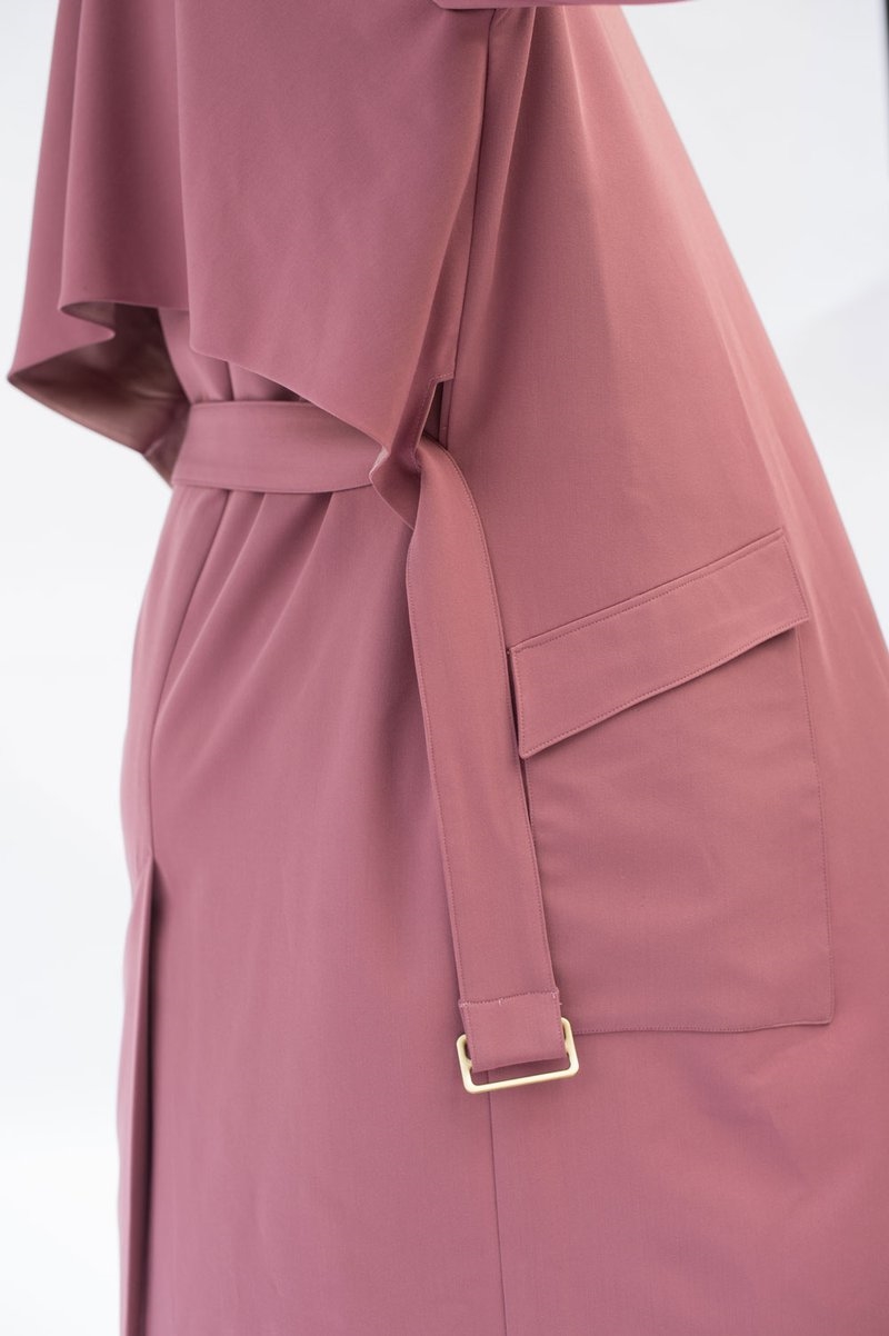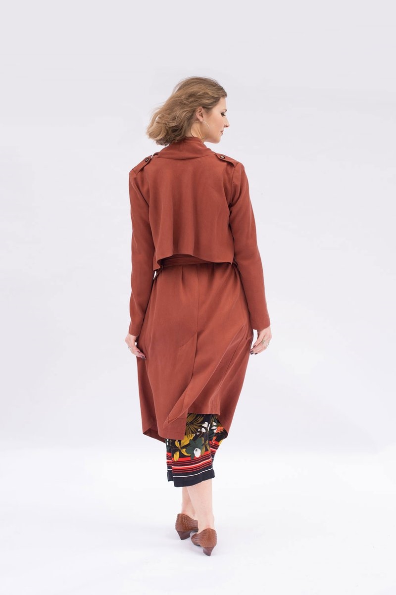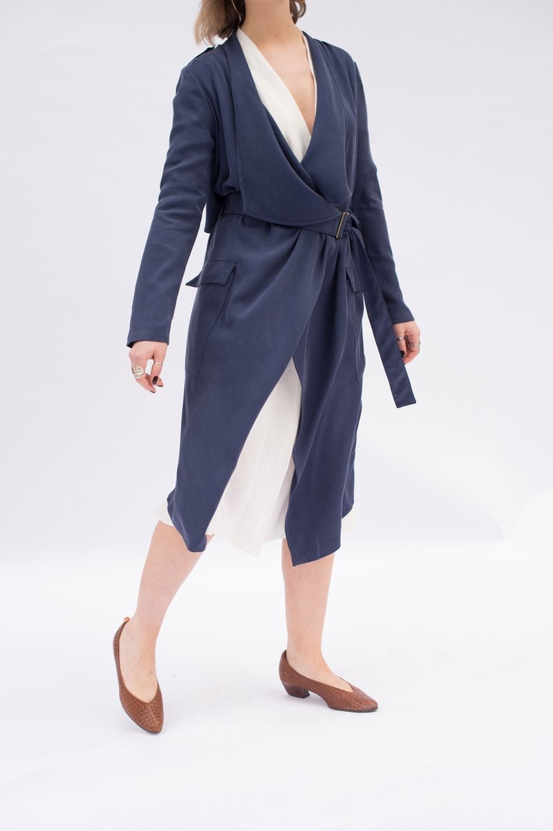 "ULYSSES mixes trench coat styling with a modern look. This relaxed, straight-cut jacket features draped elements such as a shawl collar and a clean-lined, curved back "rain guard" overlay. Notched-out holes along the sides seam of the overlay allow the jacket's belt to exit through from the back to the front. Other features include shoulder epaulettes, clean-lined, angled patch pockets with an upper flap, a center-back vent, and a gently angled hemline at the front.The body of the coat is unlined, making this a perfect, cool style for the warmer months. Instructions are given for finishing seams with binding, which creates a beautiful interior finish to the garment."