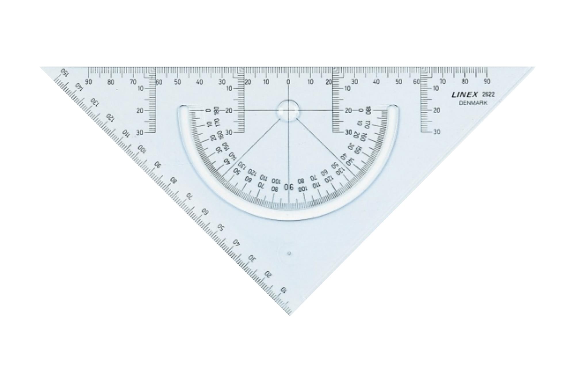 Linex tegnetrekant med vinkelmåler i klar plast. Brug linealen når du konstruerer og tegner symønstre, tilføjer sømrum og laver markeringer. Eller når du løser opgaver i geometri :-)