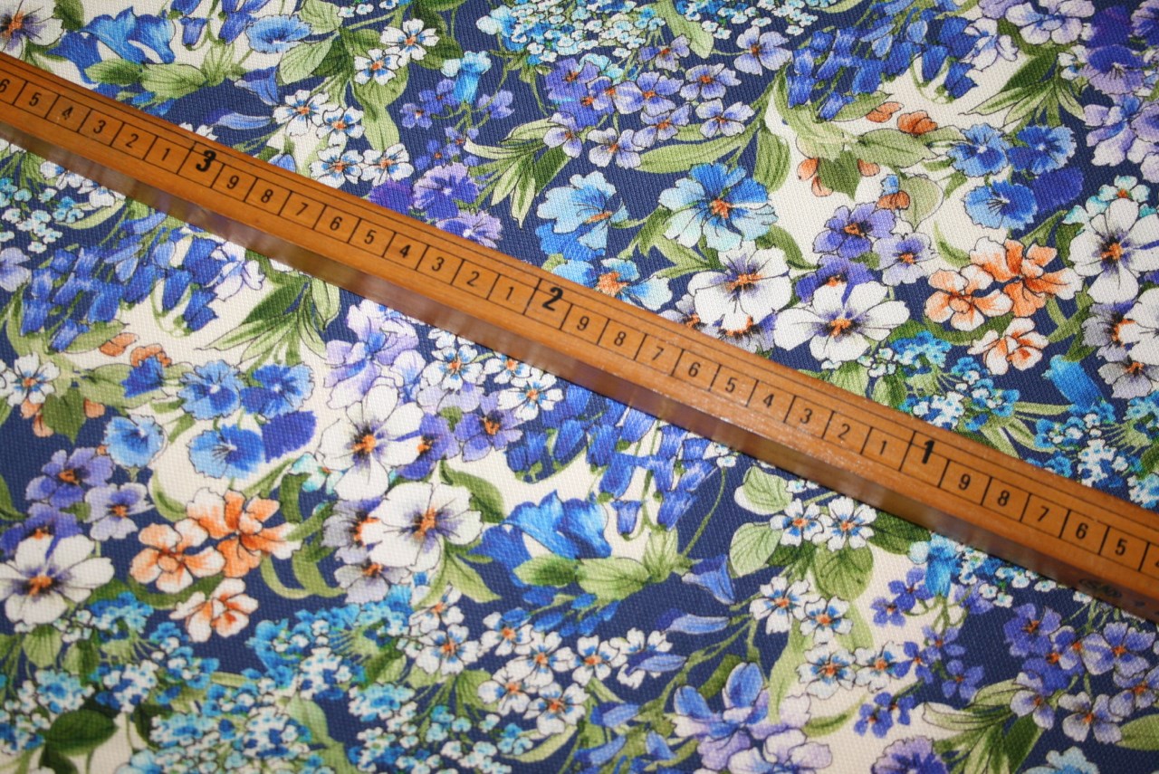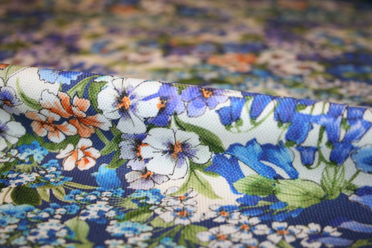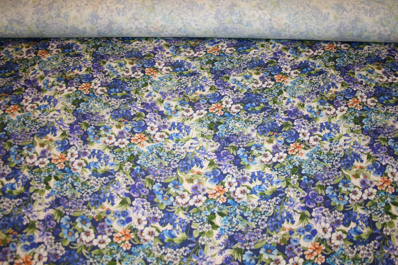 100% viscose med blomsterprint i blå, lilla og grønne nuancer. Stoffet har en flot vævet tekstur, der tilføjer en ekstra dimension. Kvaliteten er medium kraftig og tungtfaldende.