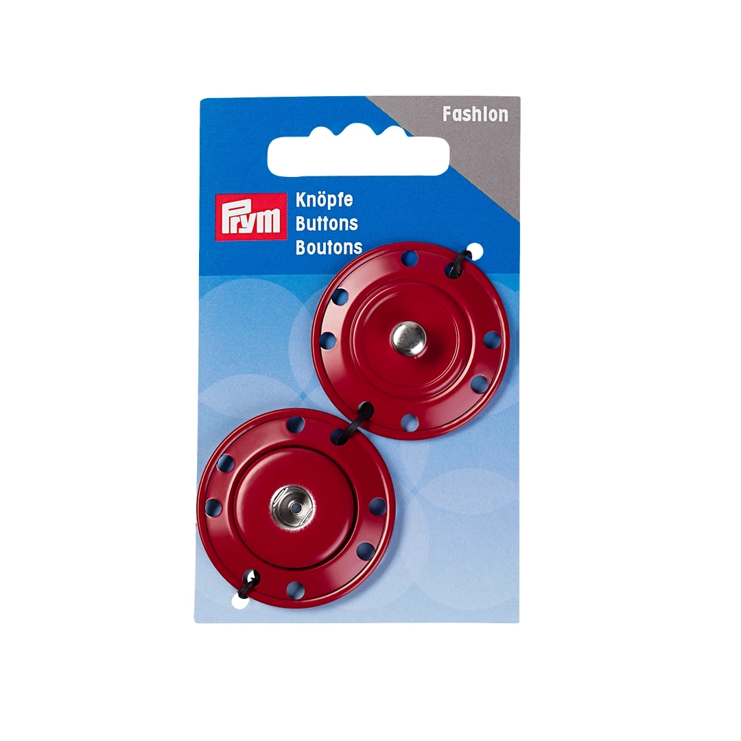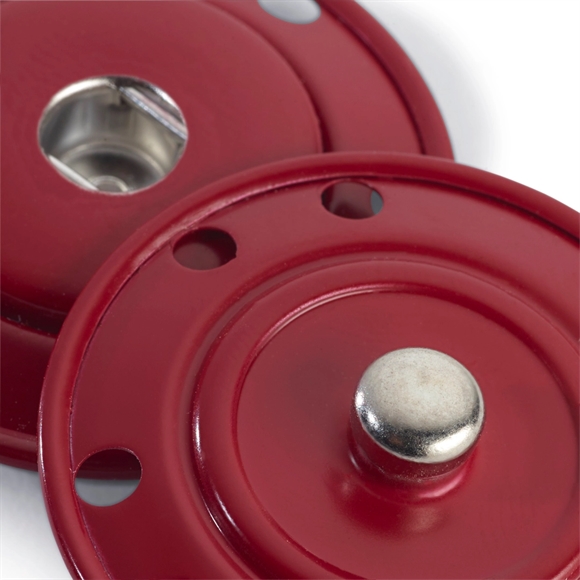 Mørkerød tryklås fra Prym. Tryklåsen der er 3,5 cm. i diameter kan bruges til lukning af overtøj.