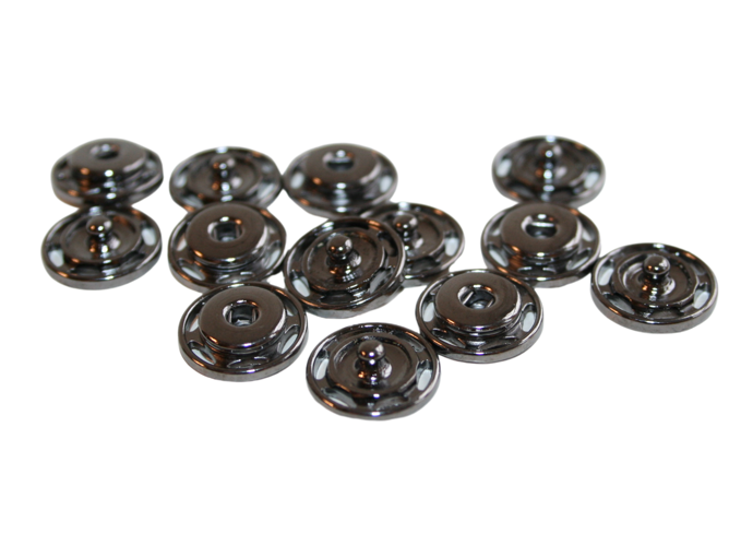 12 mm. mørk sølv tryklås til lukning af jakke / cardigan.