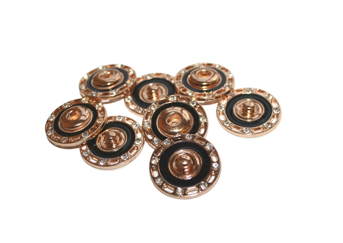 24 mm. guldfarvet trykknap til lukning af overtøj. Tryklåsen har en sort emaljerand og små rhinsten i yderkanten.