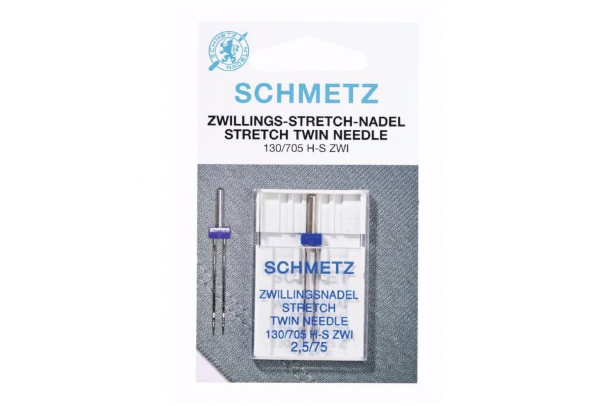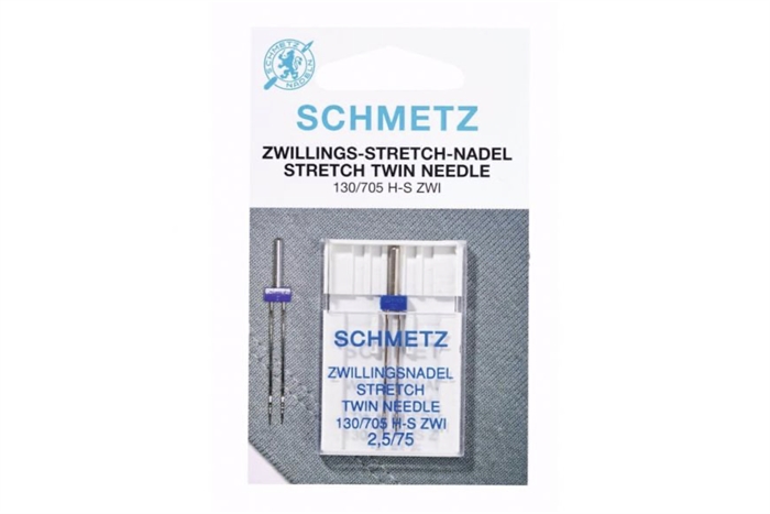 "The Schmetz Stretch Twin needle is a Stretch needle with two needles mounted on one shaft. It has been designed for sewing two simultaneous rows on highly elastic fabrics using standard home sewing machines. Supplied as a blister pack containing 1 Twin needle inside a compact plastic box for safe and practical storage"