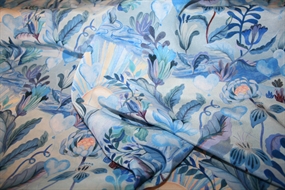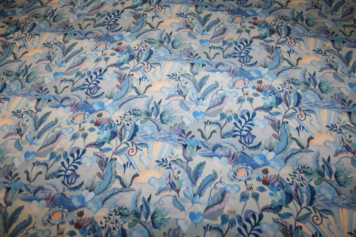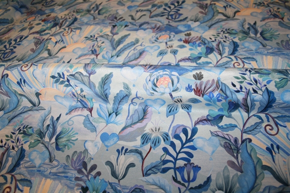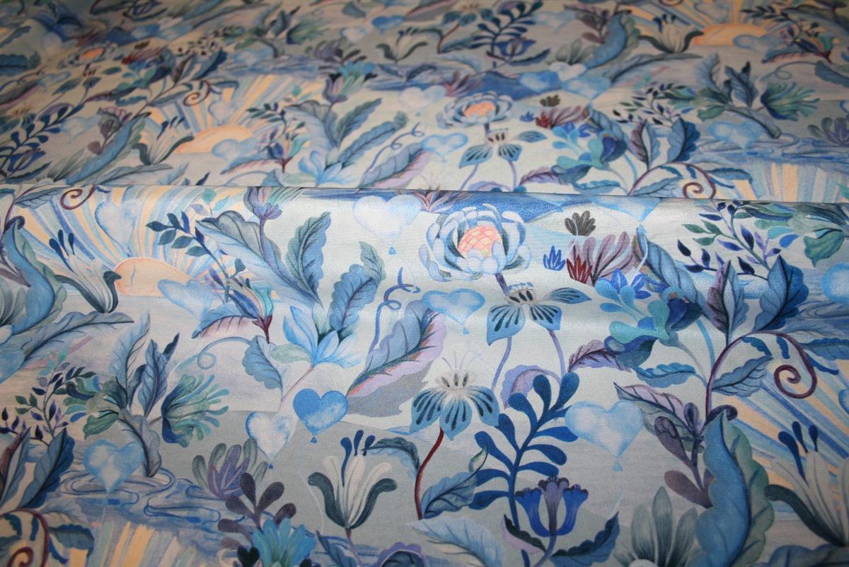 Luksuriøs silke crepe de chine med et drømmende og romantisk udtryk med et detaljeret botanisk mønster. Motivet består af kunstnerisk tegnede blomster, blade og slyngplanter, der flettes sammen i et organisk og harmonisk mønster. Baggrunden indeholder subtile elementer som solstråler og skyer, hvilket giver printet en eventyrlighed. Farvepaletten domineres af forskellige blå toner, fra sarte pasteller til dybere indigo, med små accenter af varmere nuancer, der tilføjer dybde og kontrast. Stoffet er fra Liberty Fabrics.