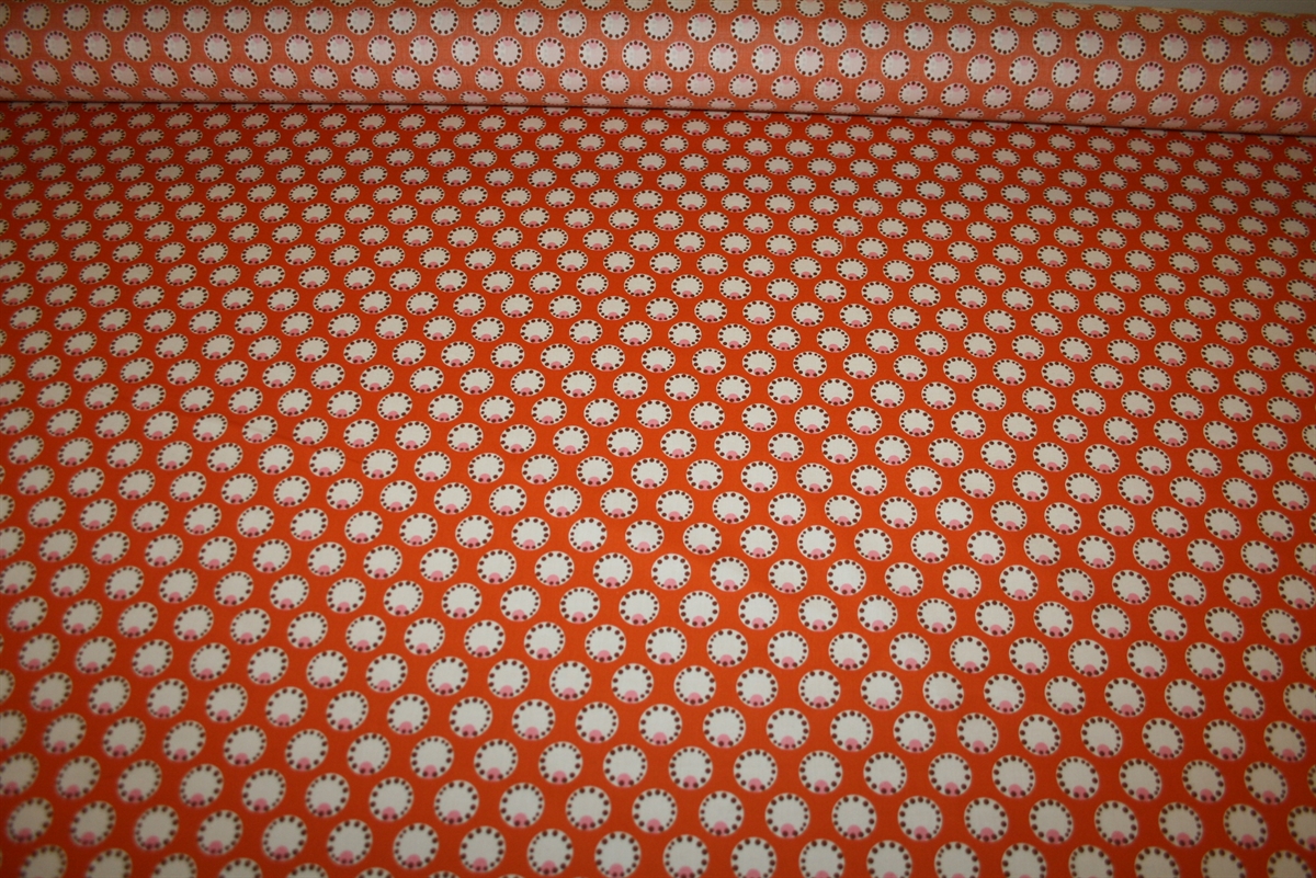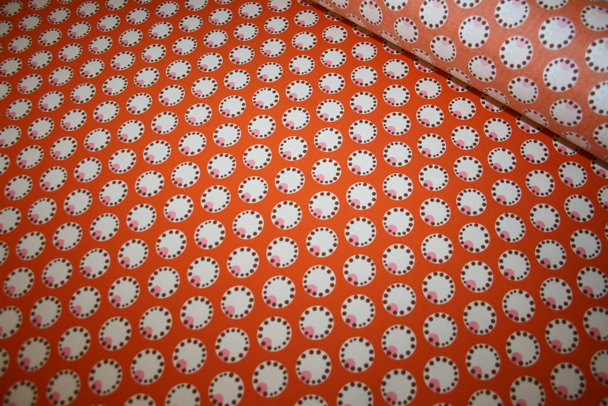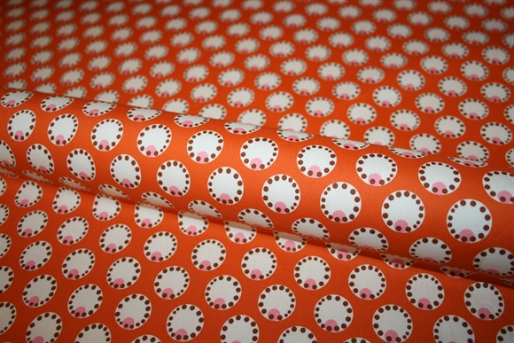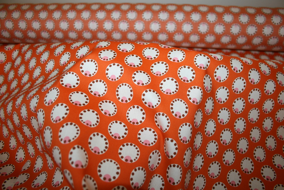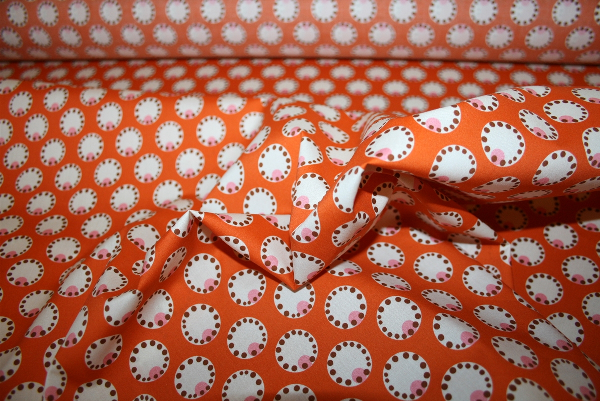 Let crisp bomuldsstretch med cirkler på en varm orange bund. Stoffet er produceret for Prada.