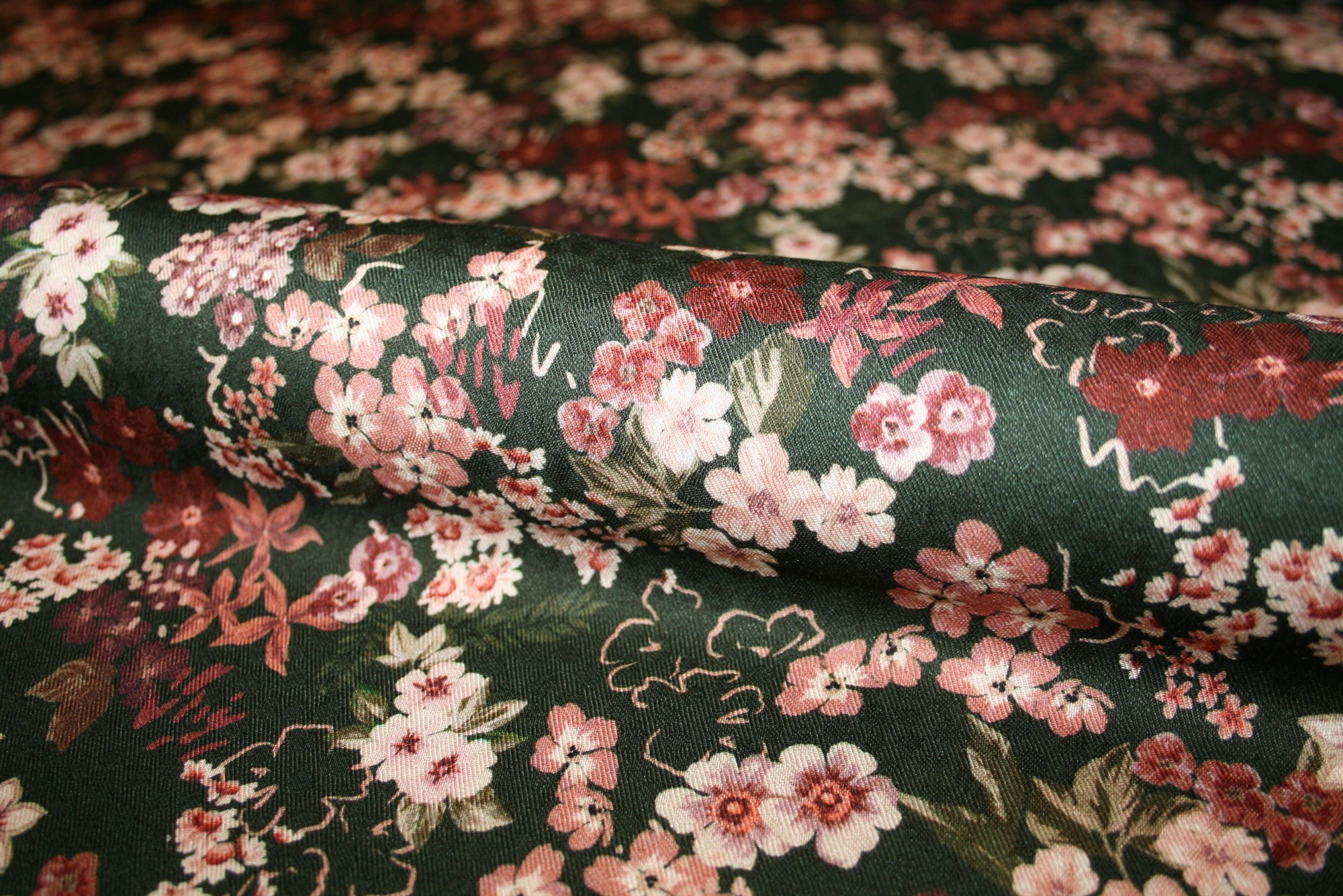 Jacquardvævet viscose med blomster på en dyb mørkegrøn bund. Kvaliteten er silkeblød og fin.