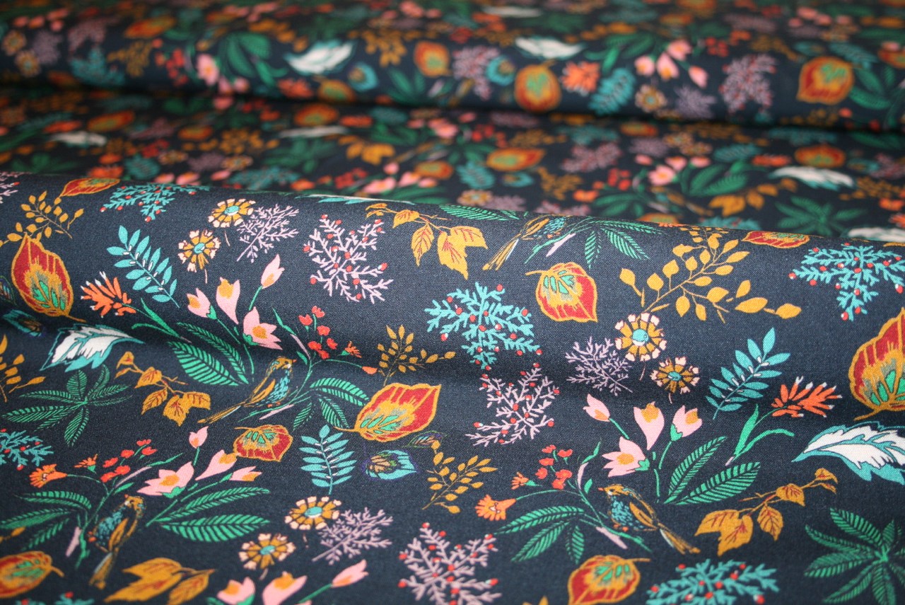 Fastvævet viscose med blomster og blade på en mørkeblå baggrund. Kvaliteten er let og tungtfaldende. Stoffet er oeko-tex certificeret, dvs. uden skadelig kemi.