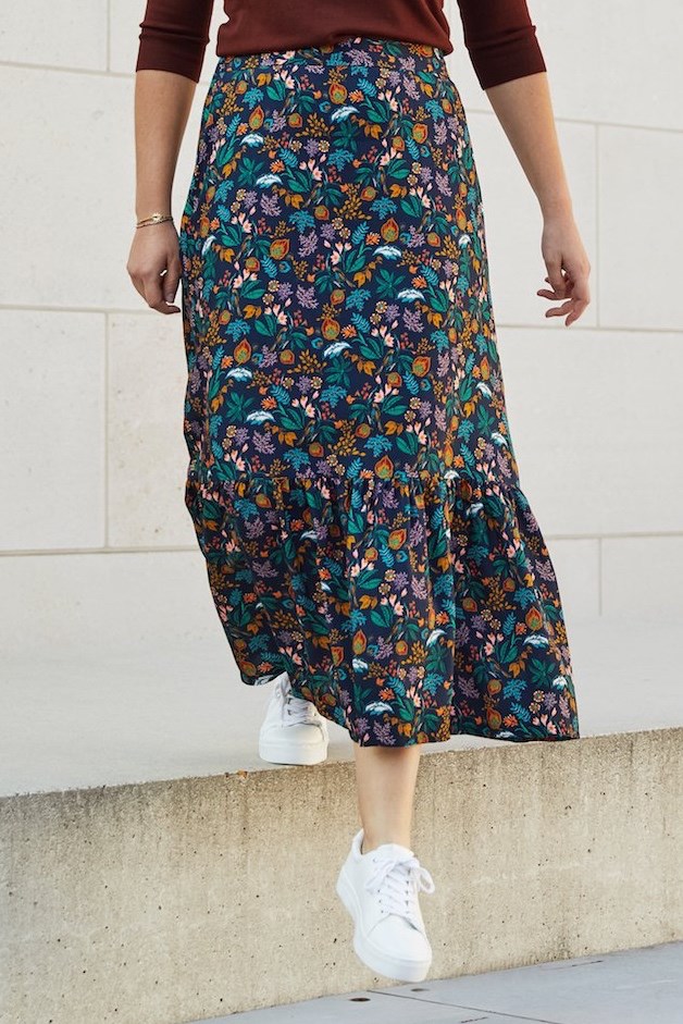Nederdel i blomstret viscose stofBlomstret viscose stof