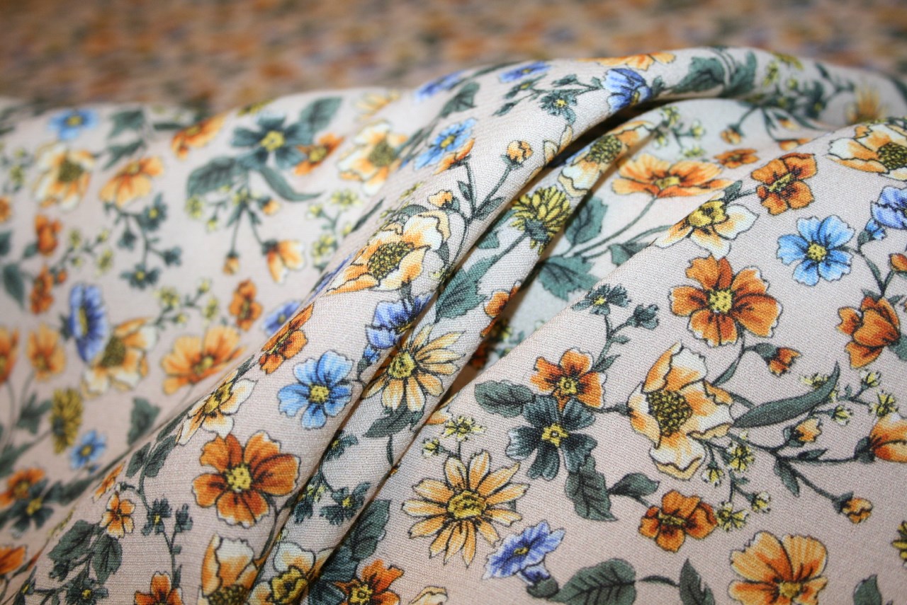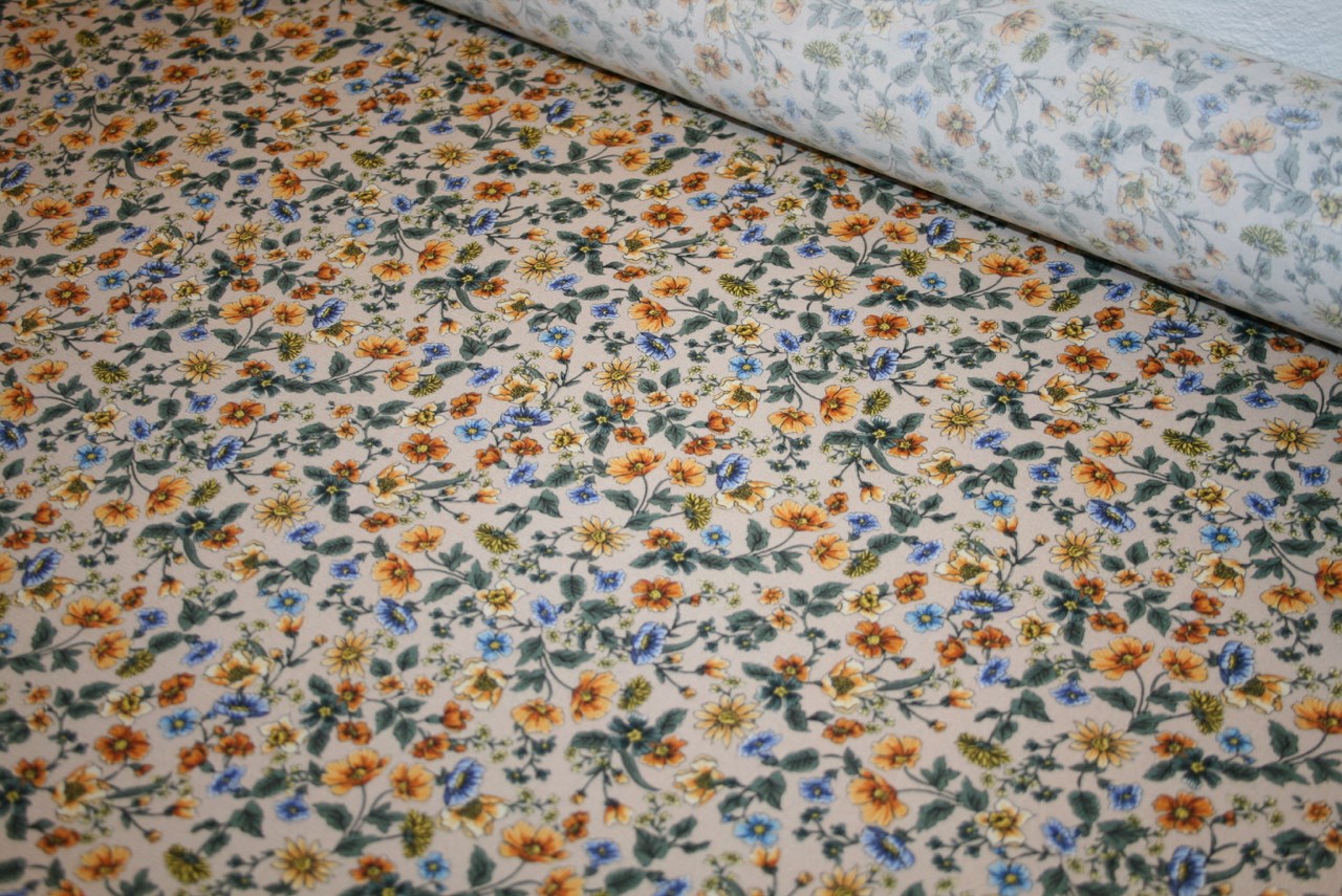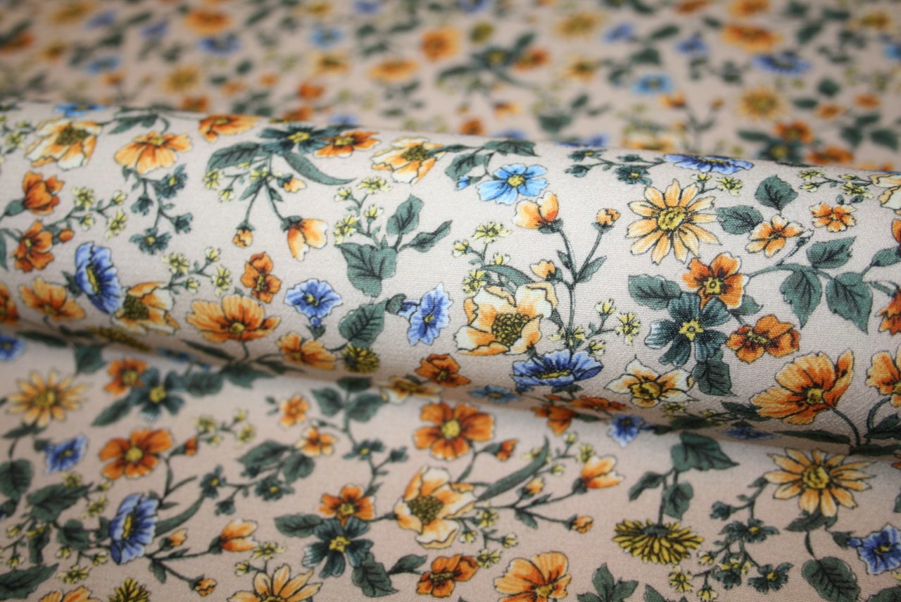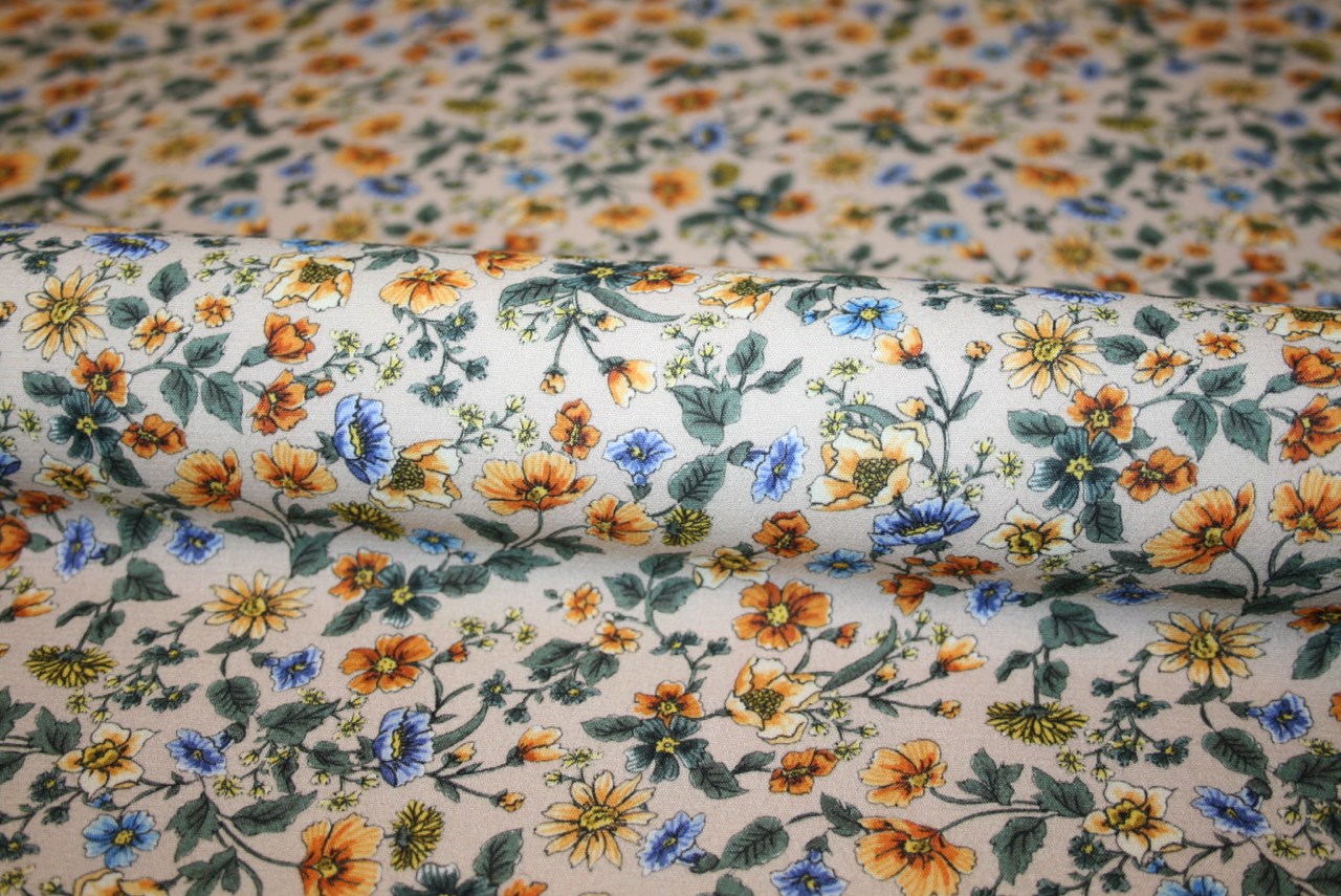 Fastvævet (EcoVero) viscose crepe med små blomster på en lys beige bund. Kvaliteten er let og lækker.