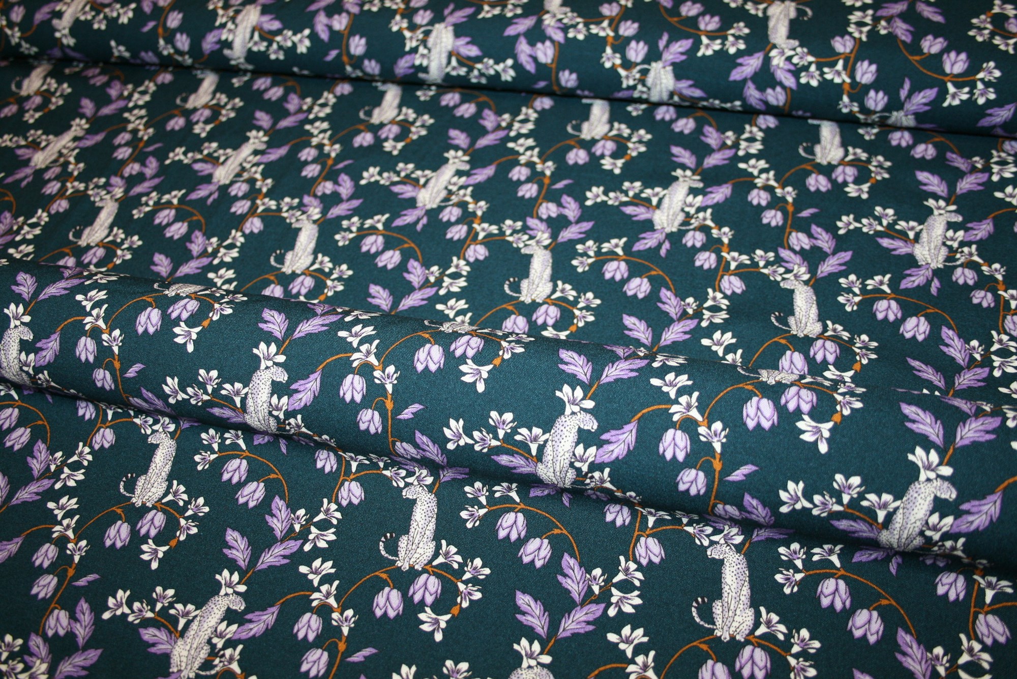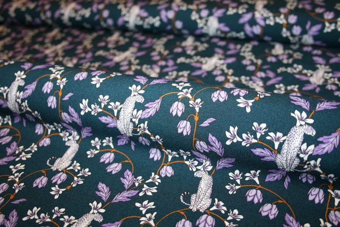 Blød fastvævet viscose med blomster og pumaer på en mørkeblå/petrolblå bund. Stoffet er oeko-tex certificeret, dvs. uden skadelig kemi.