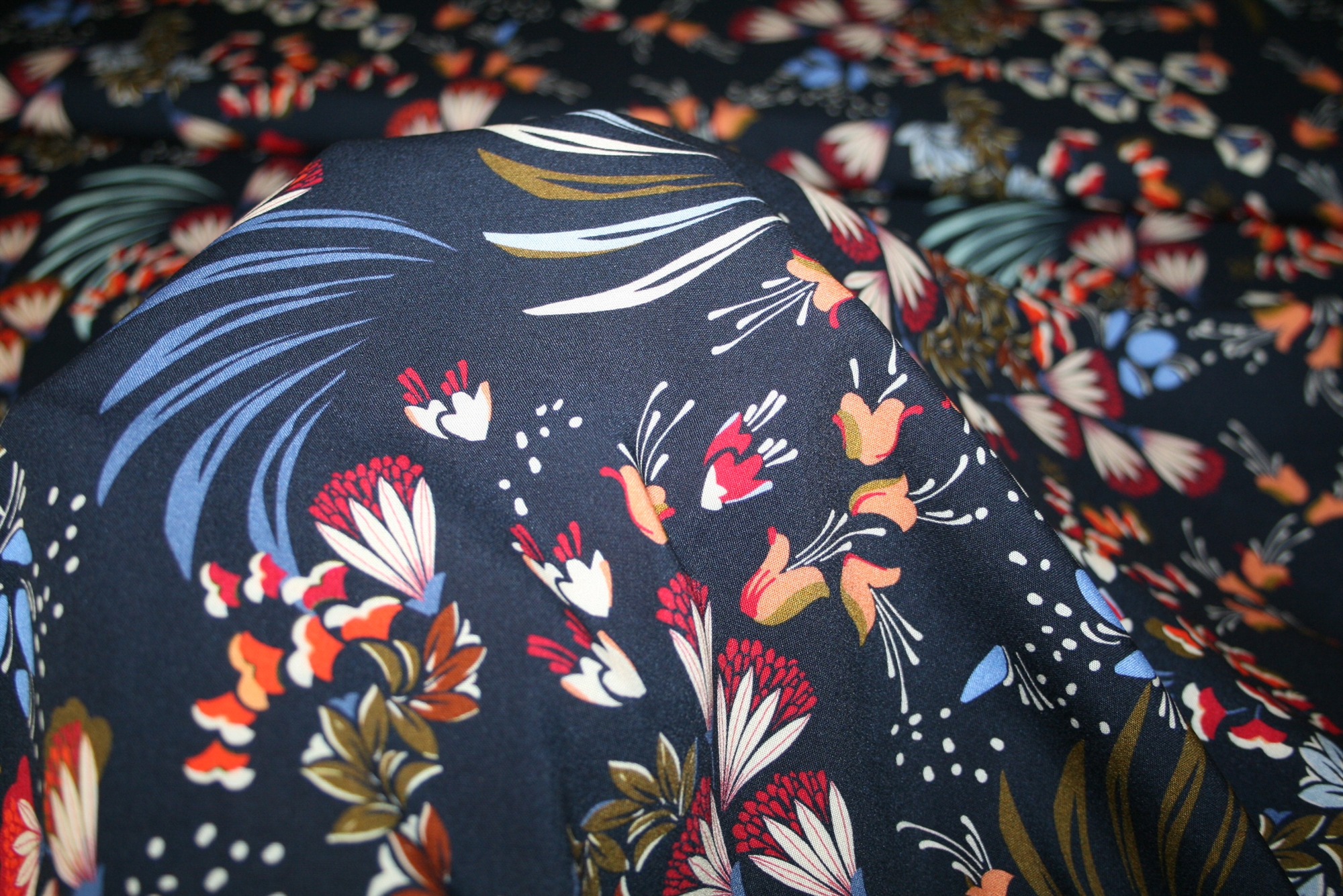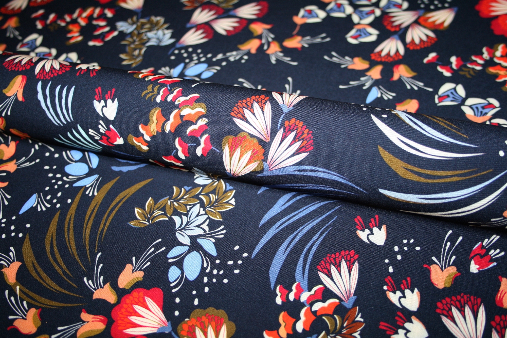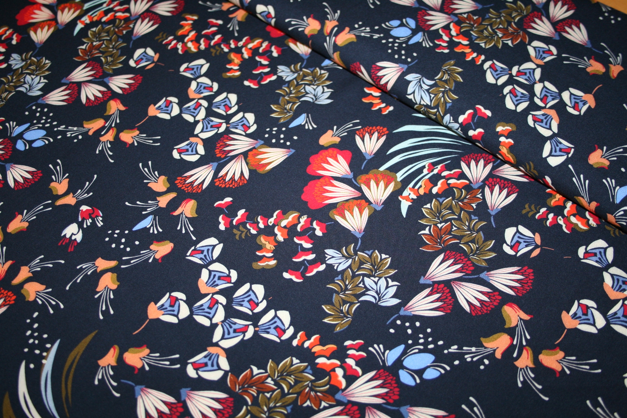 Fastvævet viscose med blomster på en navy baggrund. Kvaliteten er let og tungtfaldende. Stoffet er oeko-tex certificeret, dvs. uden skadelig kemi.