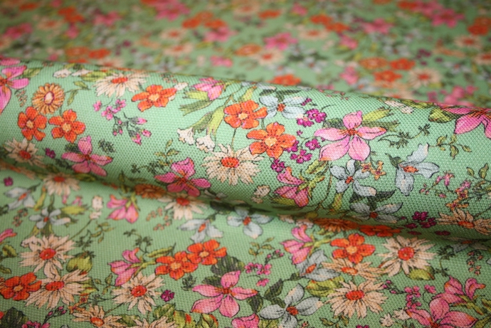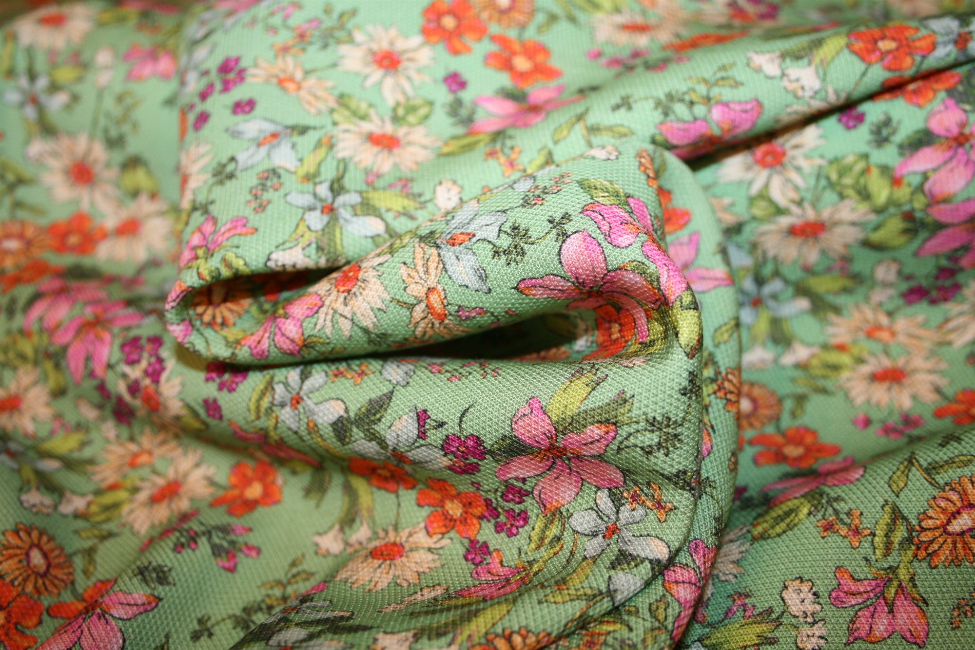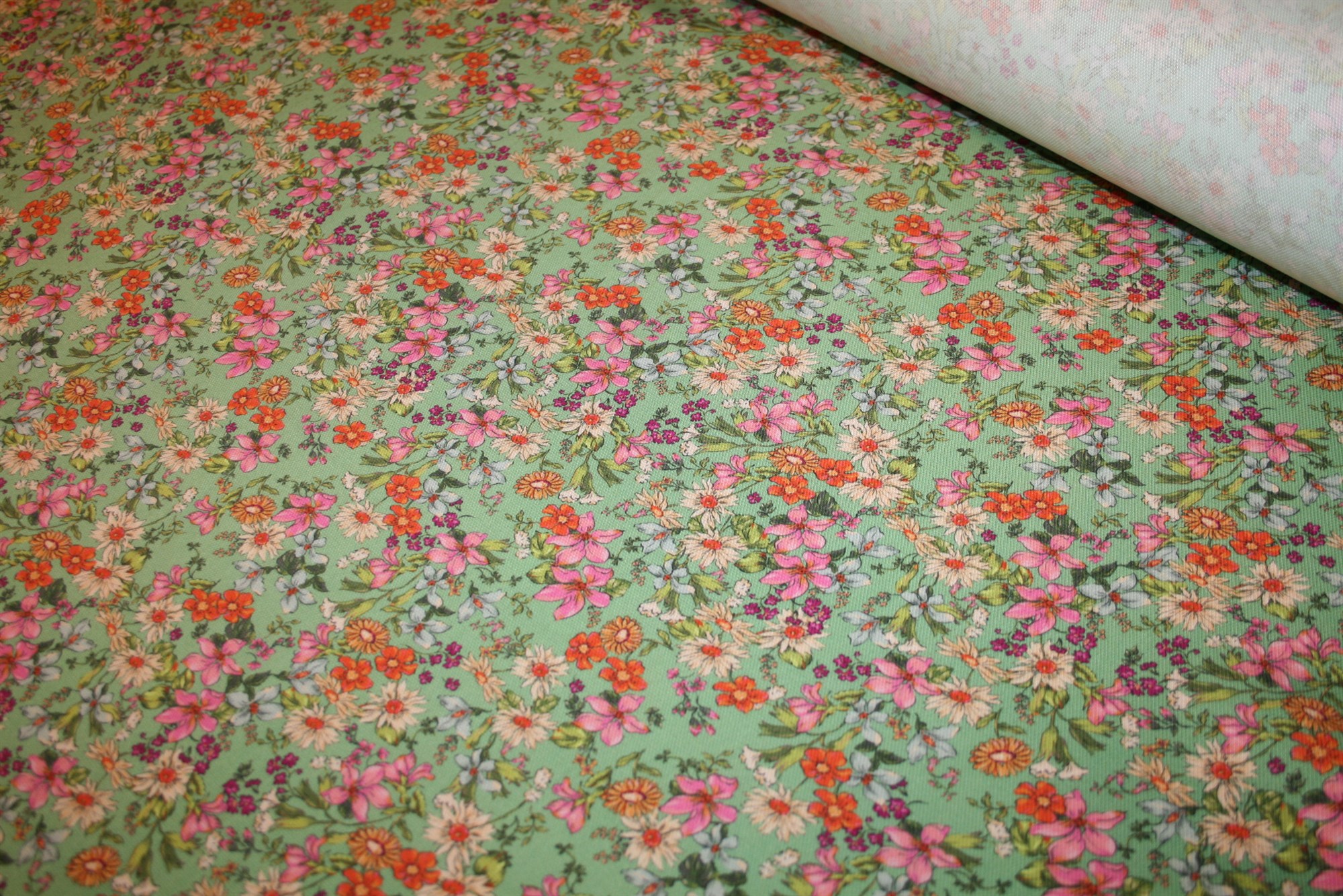 Fastvævet viscose med små blomster på en lysegrøn bund. Skøn medium kraftig og tungtfaldende italiensk kvalitet.