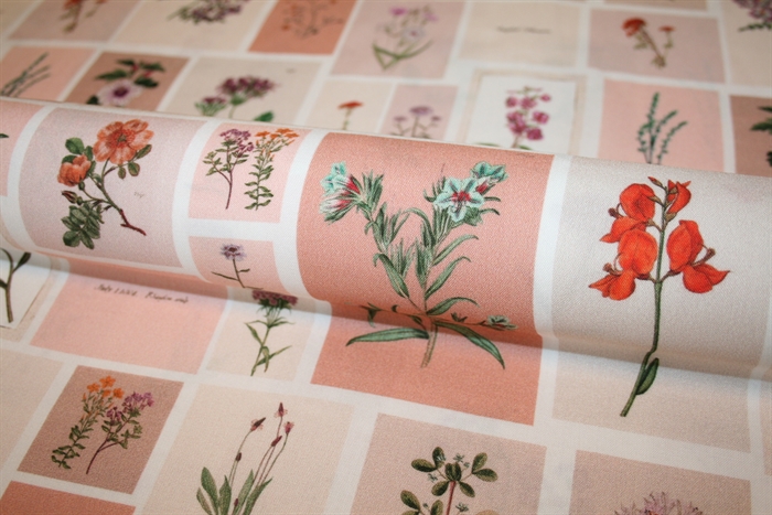 Fastvævet viscose med indrammede sommerblomster og små tekster. Kvaliteten er lækker, let og blød.