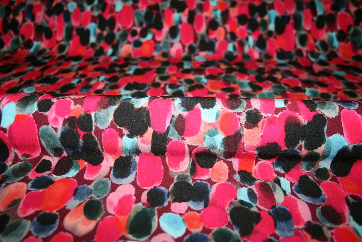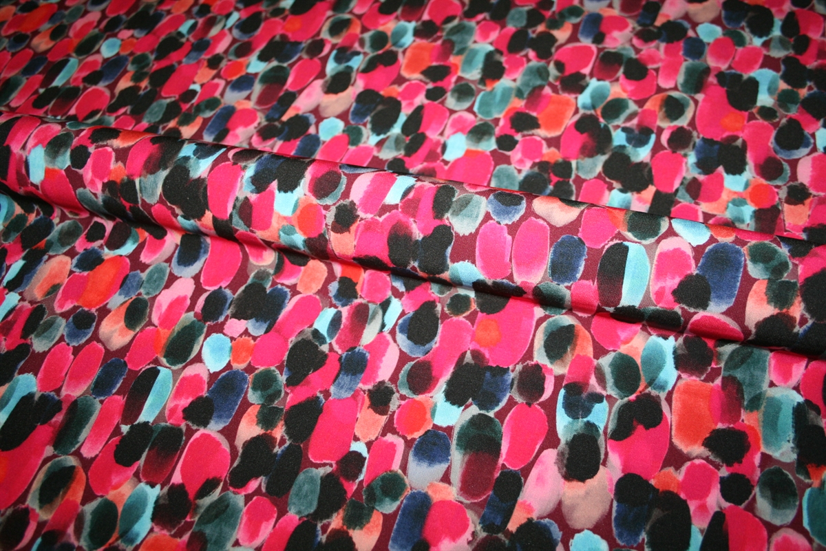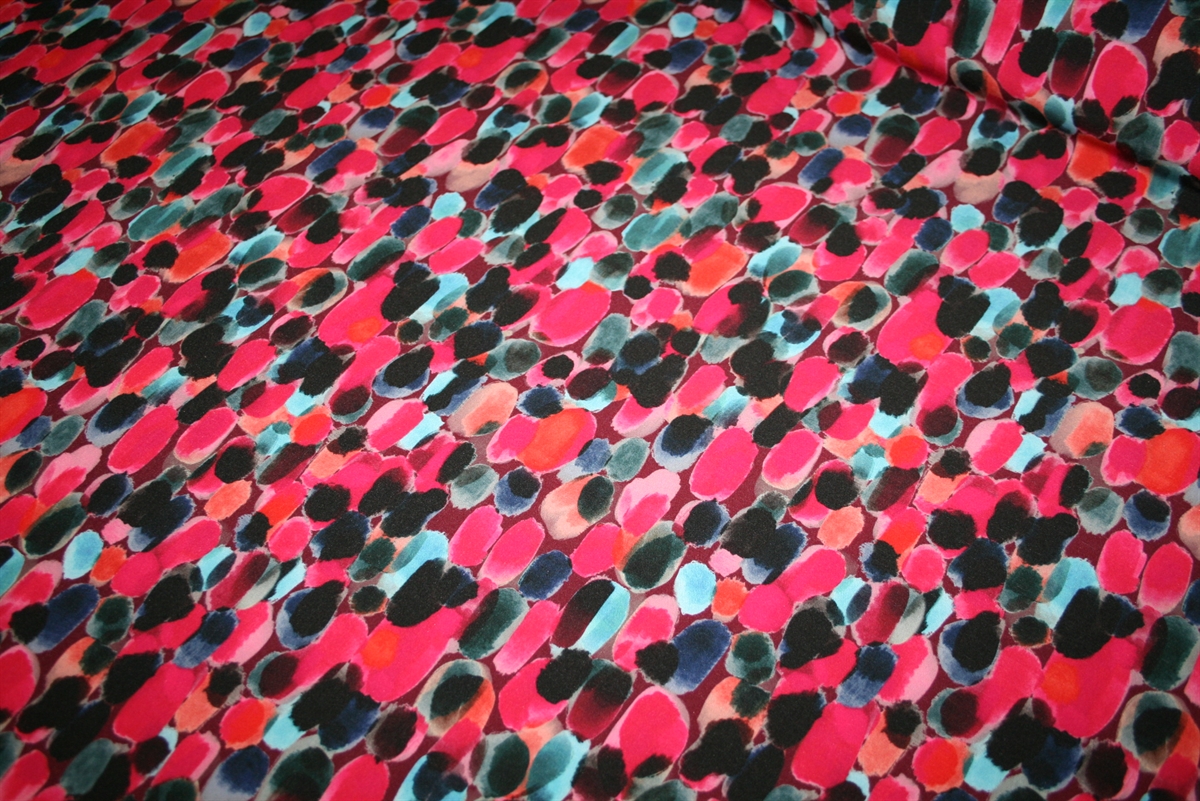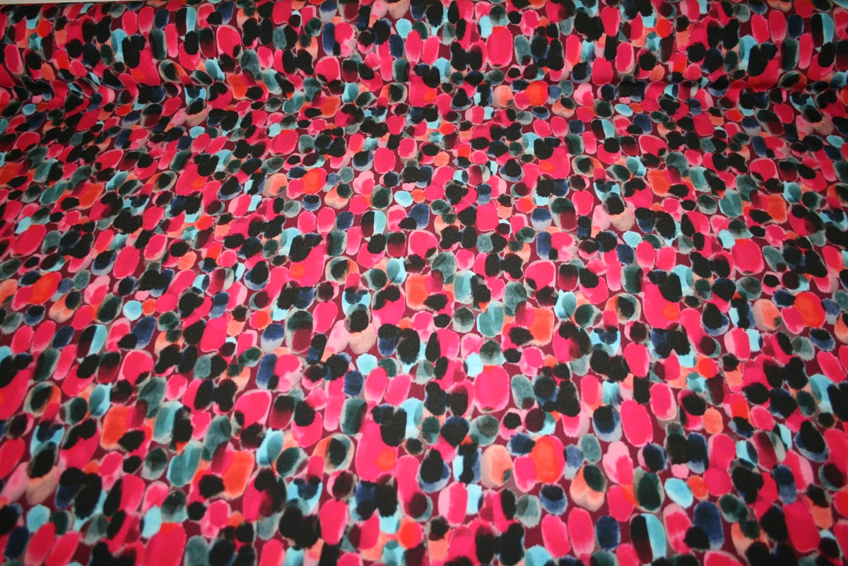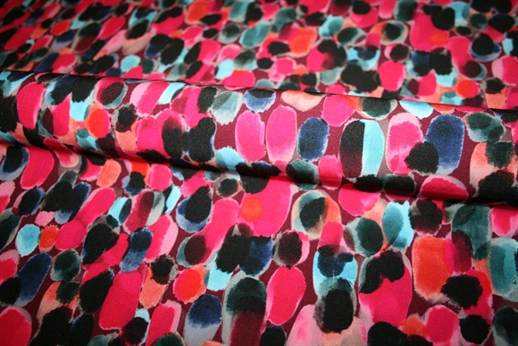 Viscose cady i en spændstig og medium kraftig vævning med et farvestrålende print. Stoffet giver sig en smule på begge leder. Stoffet er produceret for Dior.