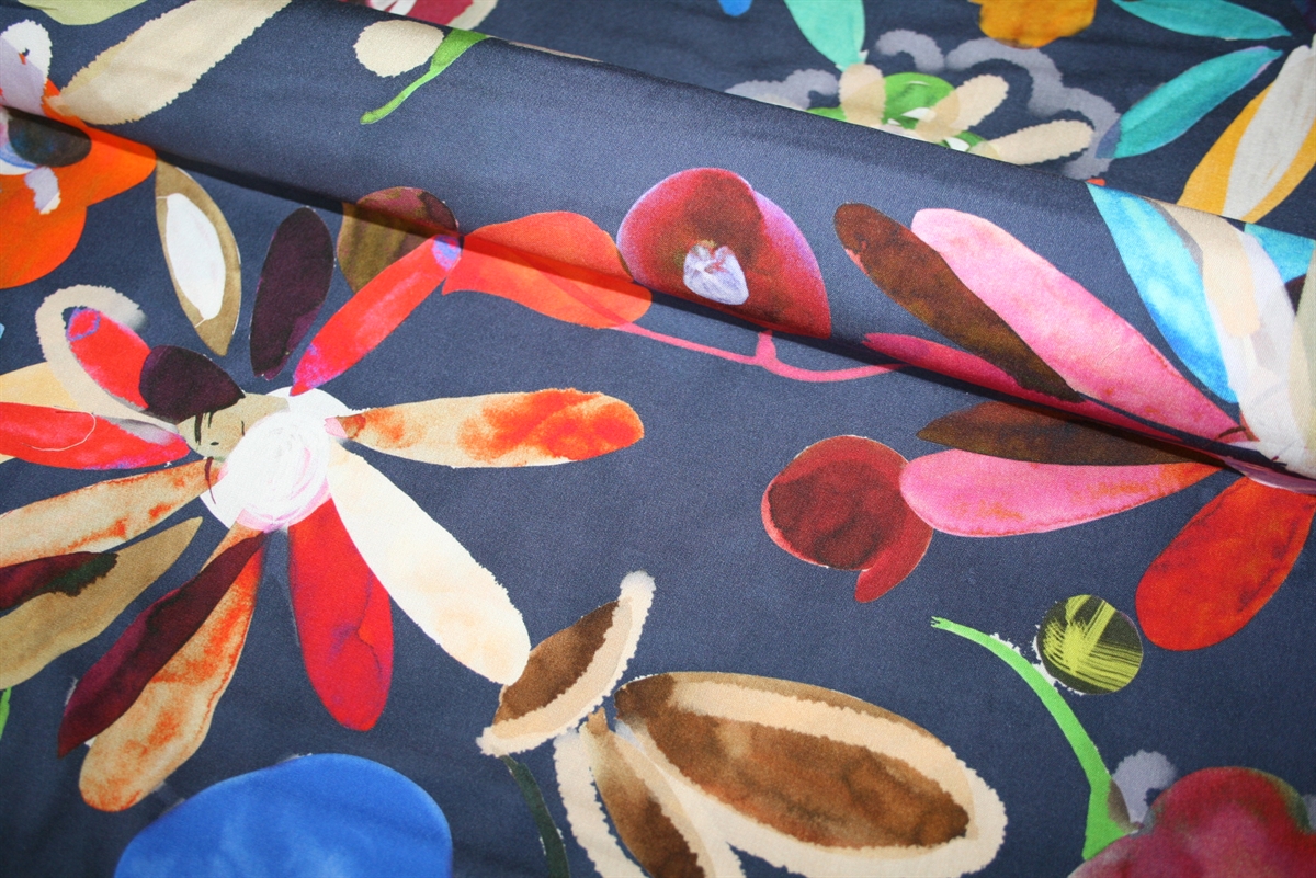 100% viscose med lidt større 'legende' blomster på en navy bund. Vævningen er fast, let og lækker og kan bl.a. bruges til at sy luftige kjoler og nederdele.
