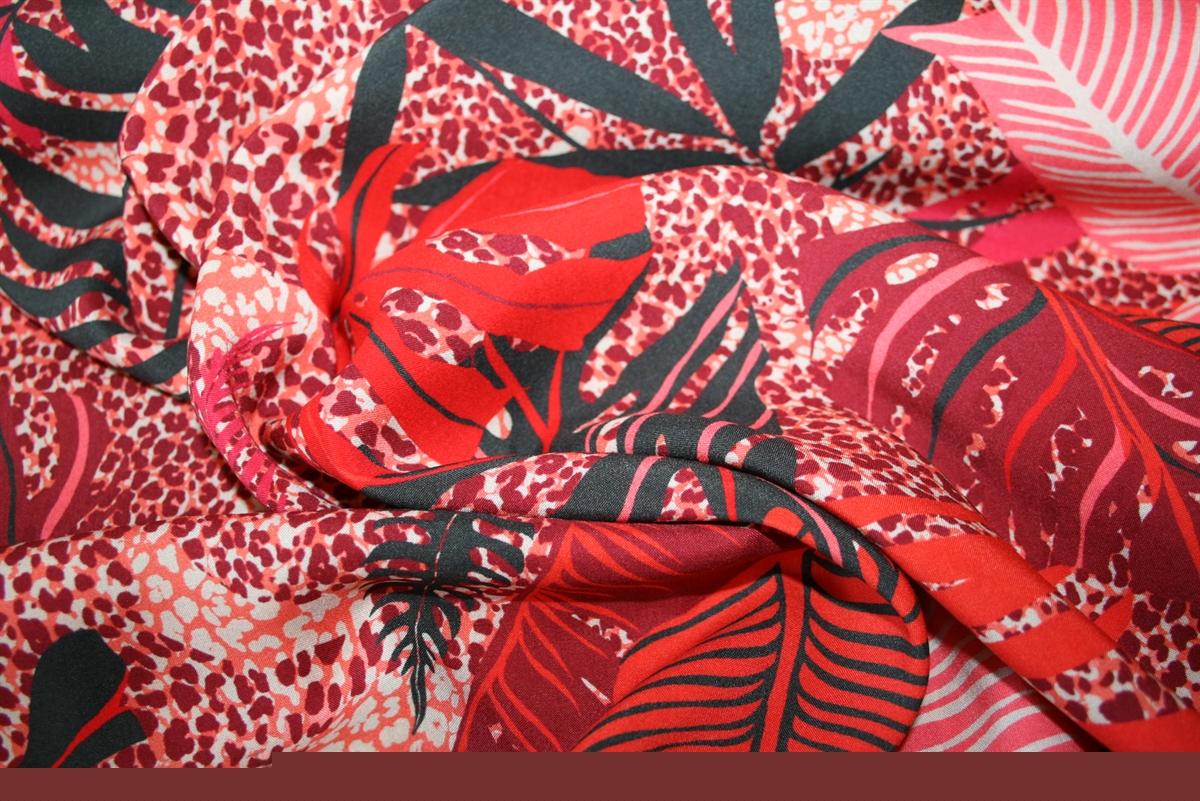 Fastvævet viscose med blade og leoprint i rødlige nuancer. Let og blød kvalitet til fx sommerkjole.
