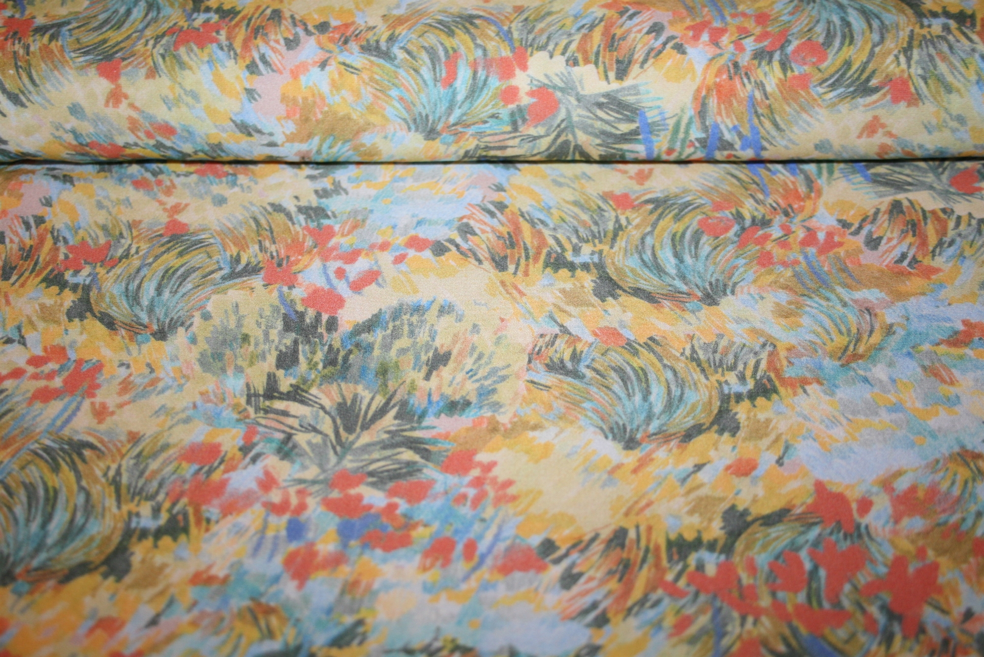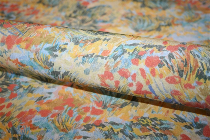 Fastvævet viscose i en let og blød italiensk kvalitet. På stoffet er et flot abstrakt blomsterprint.