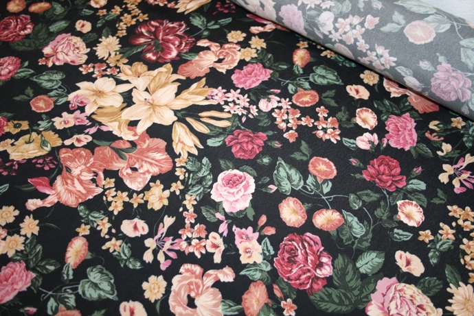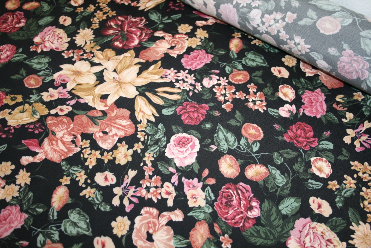 Vævet viscose crepe med blomster på en sort bund. Kvaliteten er let og glansfuld og giver sig en smule på tværs.