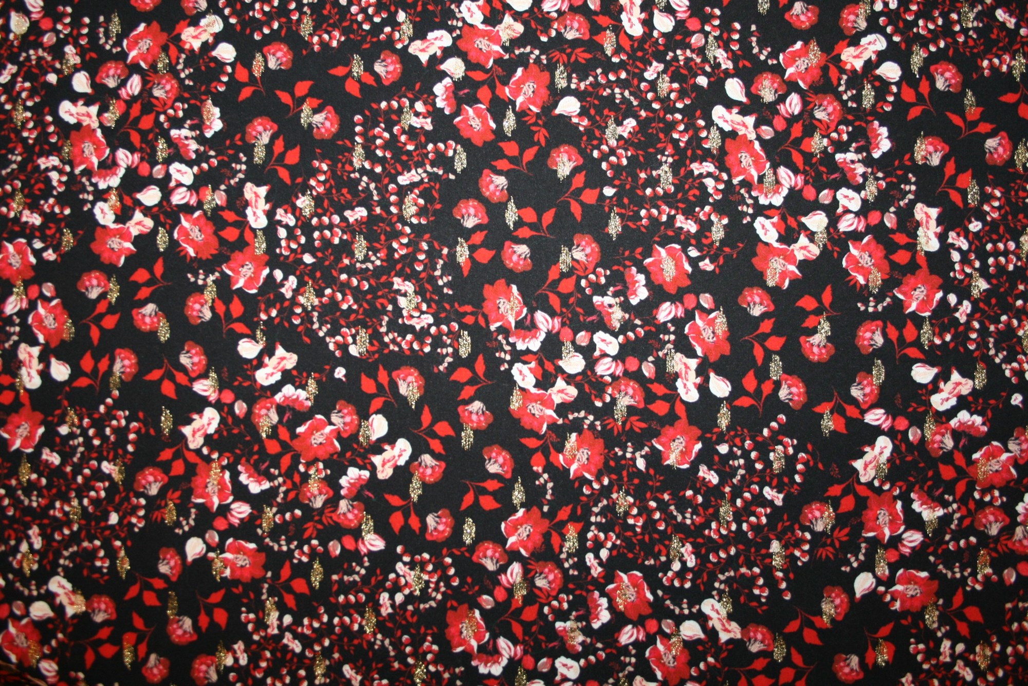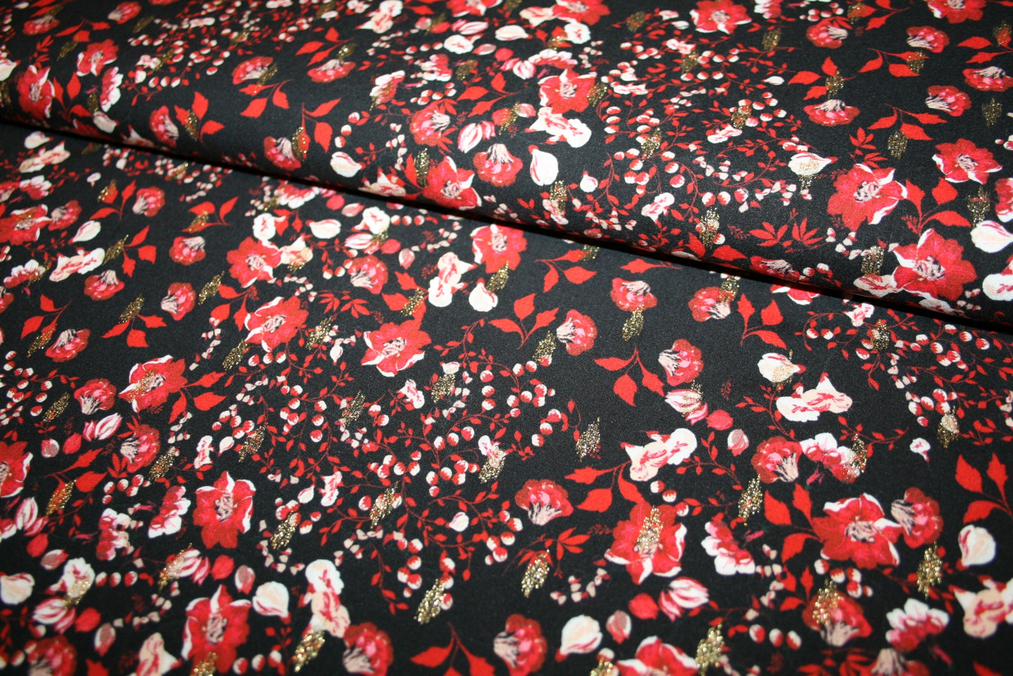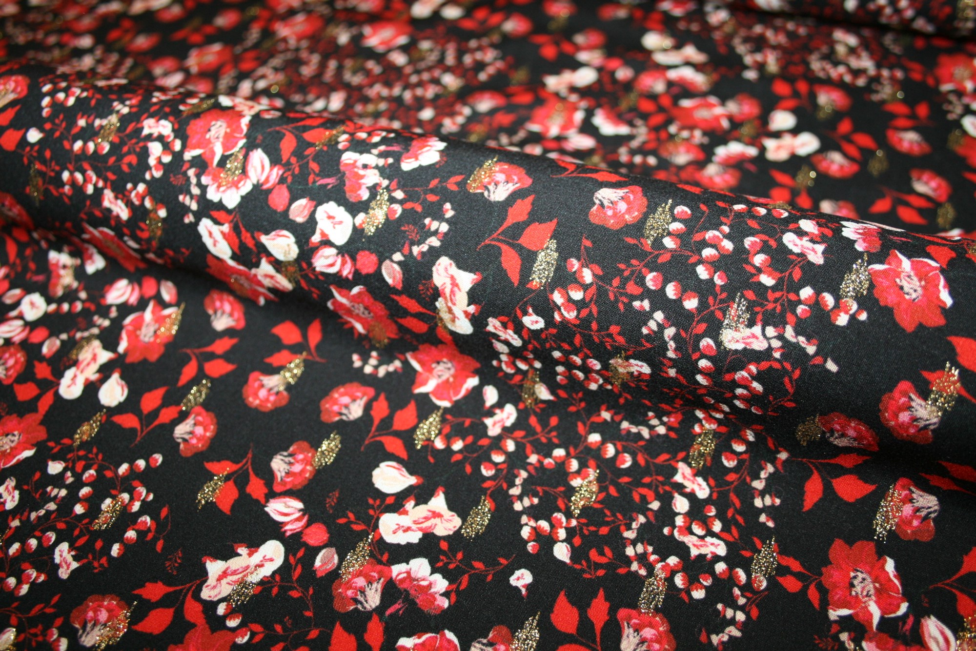 Fastvævet viscose med små røde blomster og skinnende guldlurex på en sort bund. Kvaliteten er let og fin. Stoffet er oeko-tex certificeret, dvs. uden skadelig kemi.