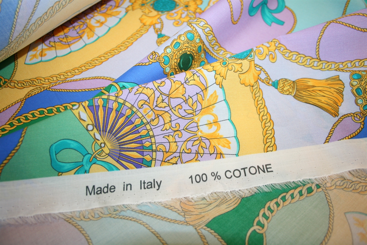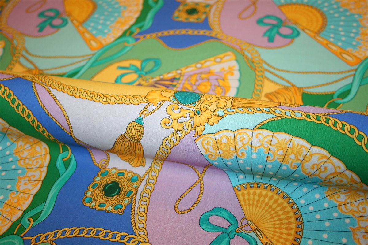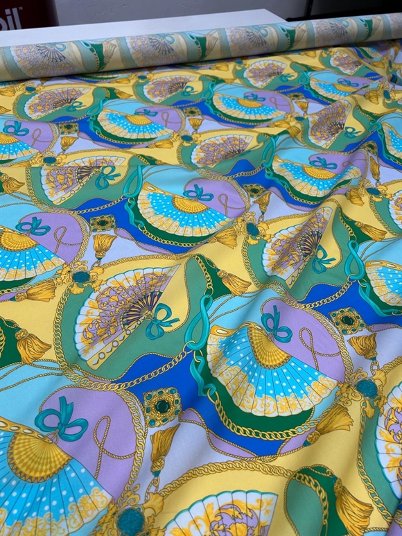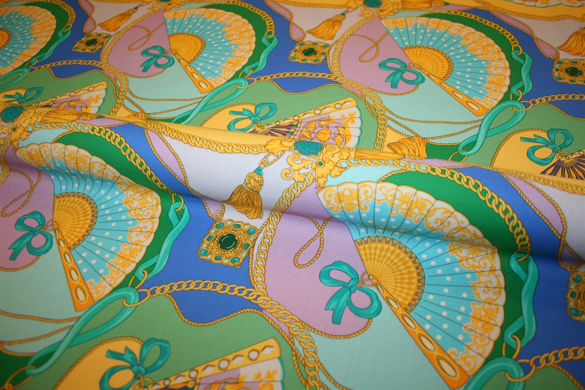 Et iøjnefaldende og dekorativt bomuldsstof med satinvævet overflade, der giver en let glans og en eksklusiv finish. Stoffet er trykt med et detaljeret mønster af elegante vifter, kæder og smykkelignende ornamenter, der skaber et sofistikeret udtryk.
