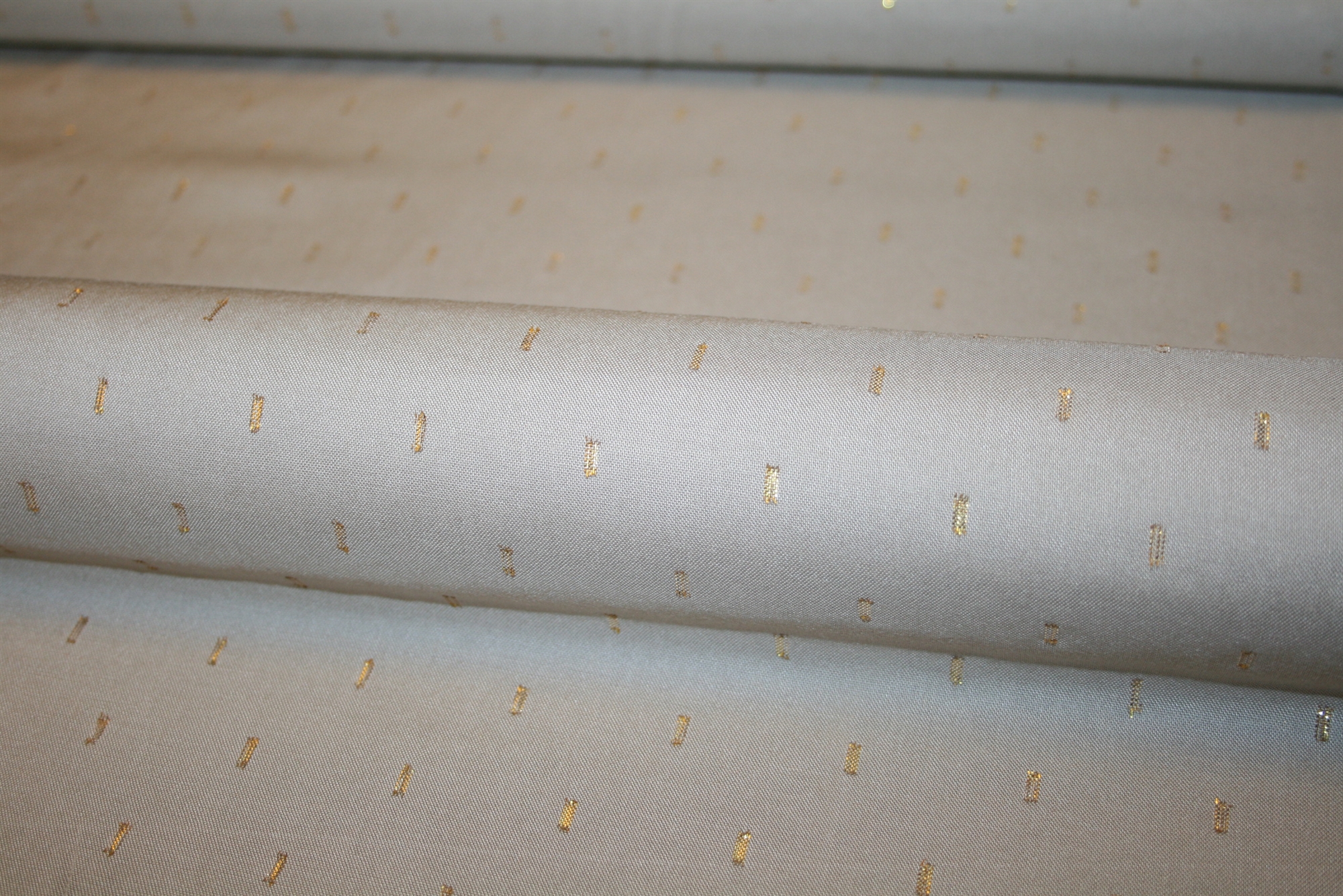 Fastvævet sandfarvet viscose med guldlurex. Kvaliteten er blød, let og tæt.