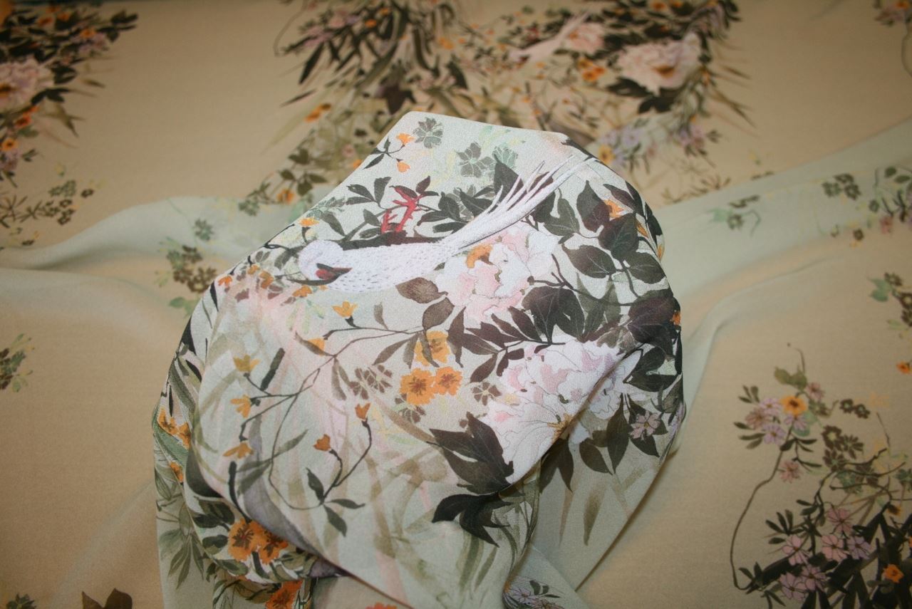Viscose crepe med et større mønsterprint af blomster og fugle på en pastel lysegrøn bund. Stoffet er med stretch og i en let transparent kvalitet, der ikke krøller.