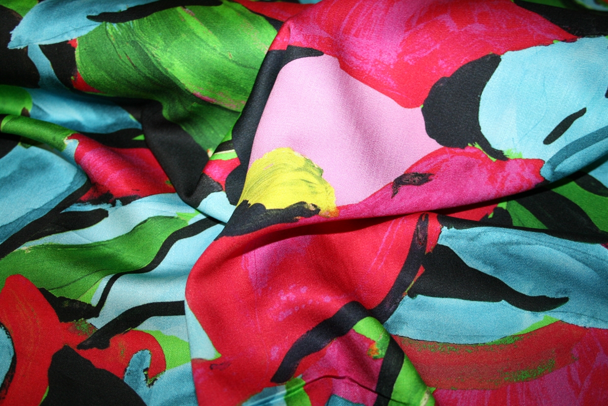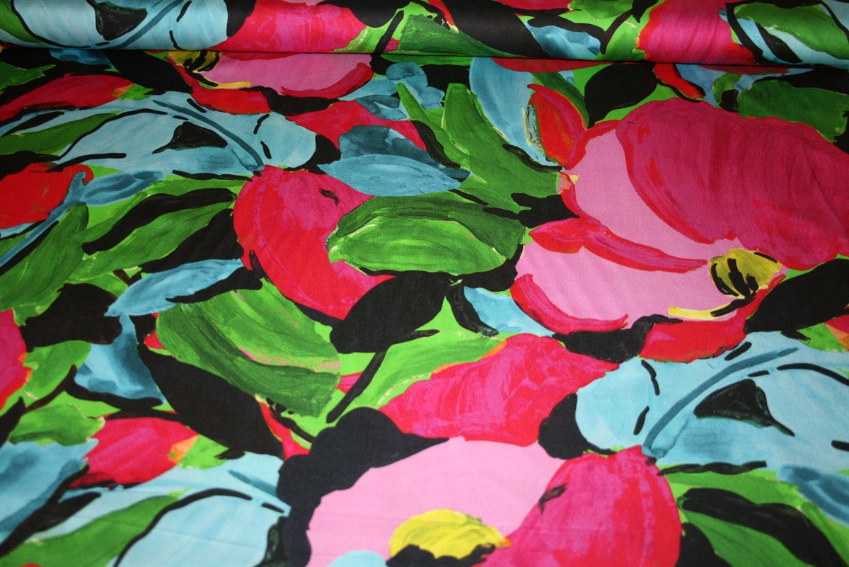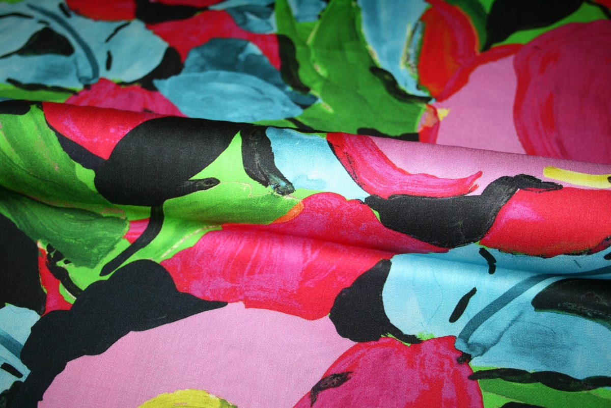 Smørblød satinvævet viscose med store farvestrålende blomsterakvareller. Satinvævningen giver stoffet en eksklusiv og glansfuld overflade.