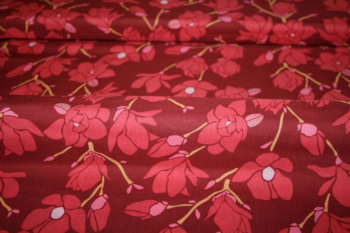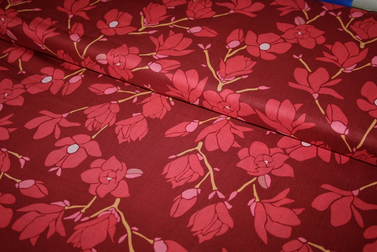 Blød og fin viscose med print af magnoliaer. Stoffet er oeko-tex certificeret, dvs. uden skadelig kemi.