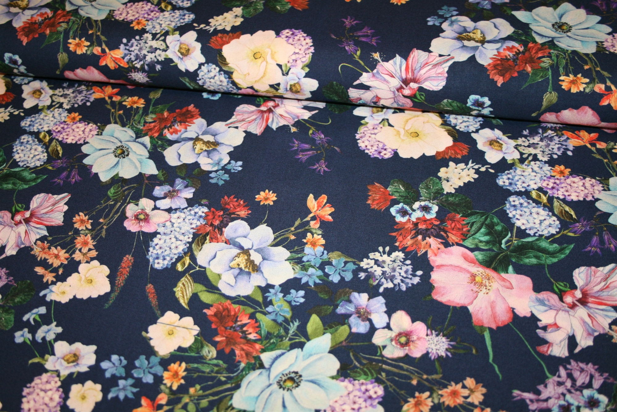 Fastvævet viscose med blomster på en navy bund. Kvaliteten er blød og let.